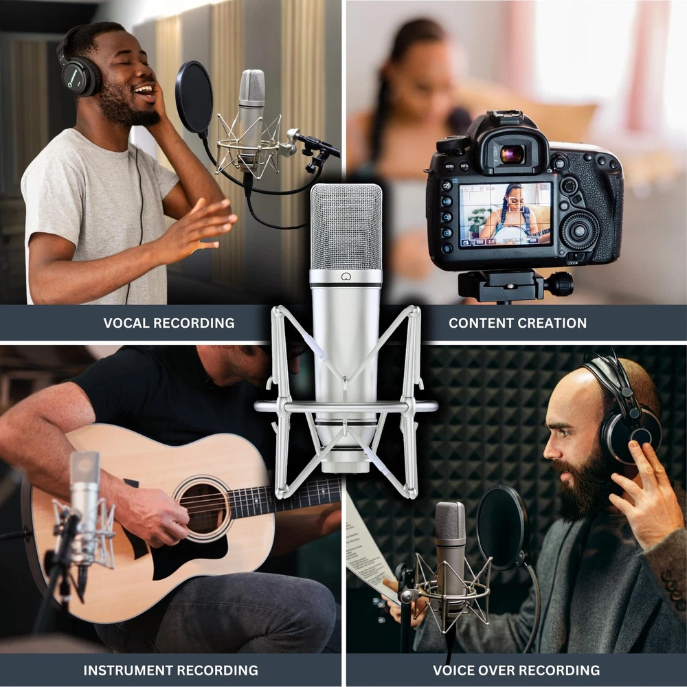 The MA-87 microphone is an exceptional microphone, emulating the look and design of a classic Neumann U87 mini microphone. The metal build of this XLR microphone offers a durable robust body and grill, made to handle the everyday knocks of home studio recording equipment. The MA-87 offers a 26mm capsule, making it the perfect microphone for singing, recording vocals in your home music studio, podcasting and streaming. The MA-87 is a great sounding condenser microphone, but this microphone set comes with a few great accessories as well - including a silver shock mount, wind cover and XLR microphone cable. The shock mount will reduce unwanted vibrations that could be picked up by the sensitivity of the capsule, and the wind cover pop filter will help reduce unwanted plosives. Since the MA-87 is an XLR condenser microphone, it requires 48V of phantom power to function. Condenser microphones do sound very detailed for this reason, but in return require an audio interface to offer the external 48V. 🎙️ EXCEPTIONAL SOUND QUALITY - This classic 87 microphone for singing contains a large 26mm cardioid facing capsule offering a balanced low end, silky midrange and crystal clear high end frequencies 🎤 MADE FOR VOCAL RECORDING - the MA-87 will give you the results you are looking for in your home studio. NOTE: This condenser microphone requires 48V phantom power. An audio interface is recommended ⚙️ PACKED WITH ACCESSORIES - This studio microphone recording package is ready out the box. This microphone set includes a light silver shock mount, microphone cover pop filter and 4ft XLR cable. 🛠️ DURABLE BUILD QUALITY - This XLR microphone body contains a solid metal exterior, including a solid grill that is resilient to dents. The XLR cable is also of good quality.