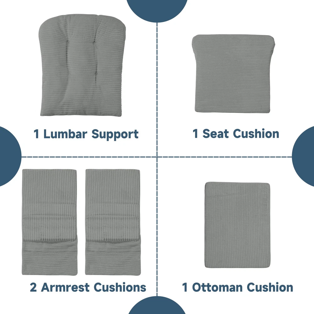 【Set Information】(NO Gliding Chair Included) Include 5 pieces. 1 backrest cushion (26*19 inches). 1 seat cushion (22""W*21""L*2.8""H). 1 ottoman cushion (21""W*16""L*2.8""H). 2 armrest cushions (12.5""L) 【Ergonomic Design】Glider rocker replacement cushions effectively support your spine and arms for a relaxing leisure time. Our glider rocking chair cushions conform better to the curves of your body, relieving pressure on your hips, tailbone, lower back and legs. 【Fabric and Filling】 Made of soft corduroy fabric to touch and very breathable. Filled with supportive solid sponge and microfibre, not collapsing, high resilience, won't flatten and supportive. 【Ingenious Storage Design】 The glider rocker replacement cushion comes with storage side pockets to support your arms and conveniently store books, toys, magazines, TV remotes, and other small items to keep you on the go. 【Ingenious Storage Design】 The glider rocker replacement cushion comes with storage side pockets to support your arms and conveniently store books, toys, magazines, TV remotes, and other small items to keep you on the go.