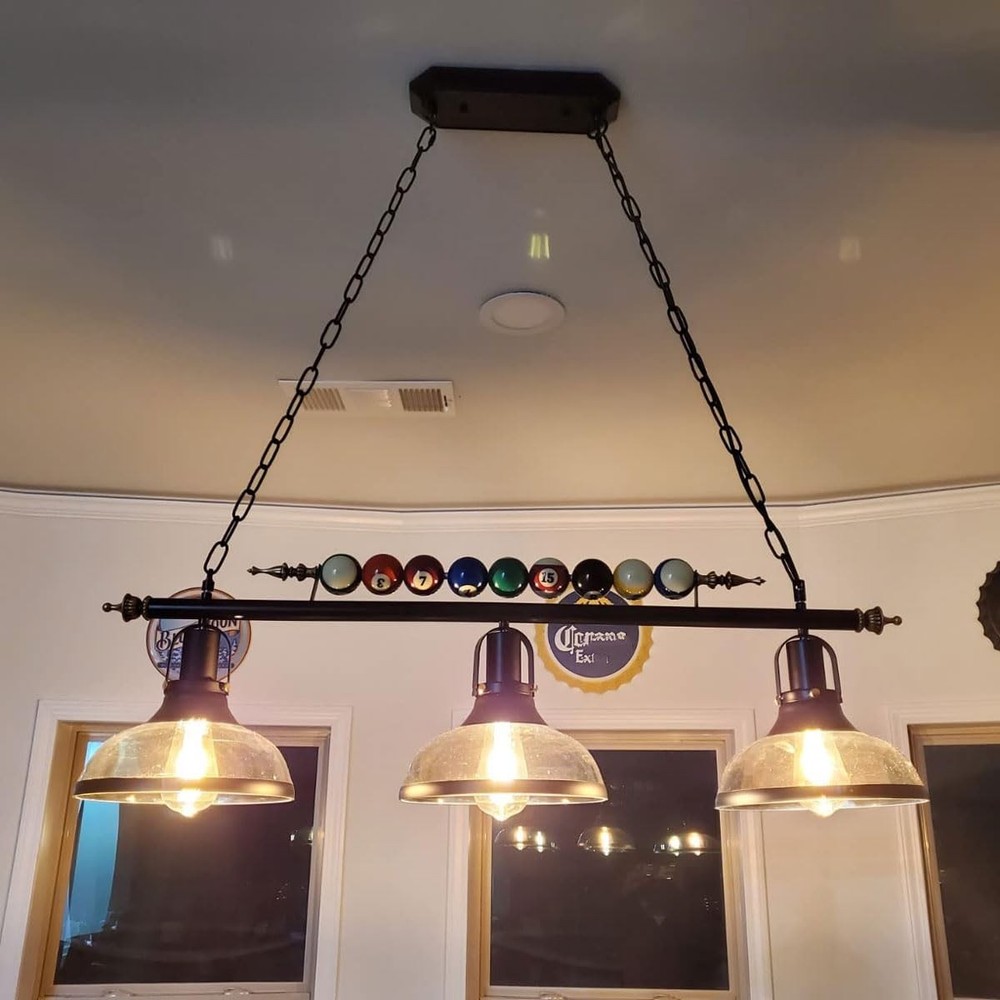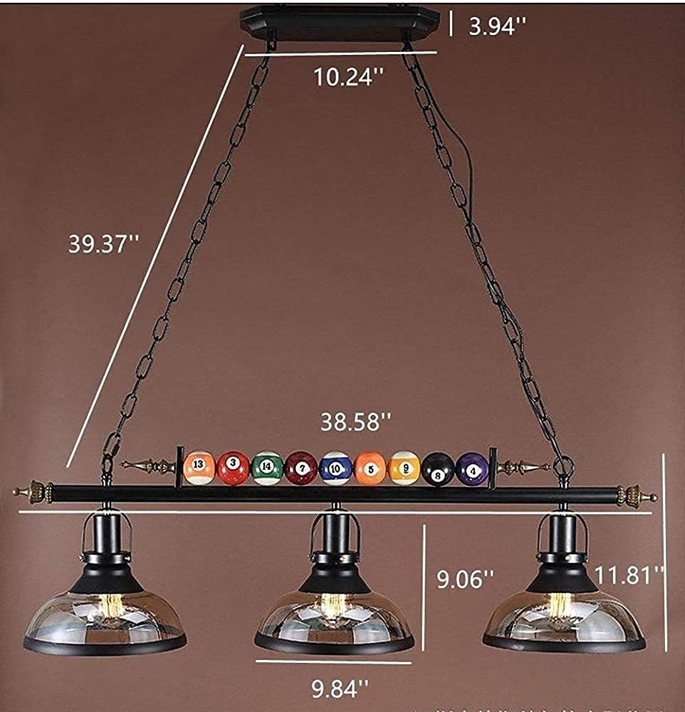 Type: Billiards pendant lamp Style: Retro / National / Industrial Chain / traction belt: height adjustable Material: Iron, glass Function: Creative billiard design Bulb socket: E27 * 3 Light bulbs include: none Power: Maximum 60 watts Voltage: 110 V ~ 240 V (inclusive) Lamp type: LED, incandescent lamp, energy-saving lamp, Edison incandescent lamp. Use:: living room, bedroom, kitchen island, dining room, bar, study, office, attic, shop, cafe, balcony, balcony, entrance hall, stairs, corridor, dining room. 【E26 bulbs and dimmable】 Each bulb has a maximum power of 60 watts (excluding bulbs) and 110-120 volts. If you want to dimming, you need to install a dimming light bulb and a dimming switch (not included). 【Great Design 】Modern living room chandeliers create a modern, elegant, and high-end impression, adding a modern and elegant atmosphere to your house. 【Purpose 】 This ceiling pendant lamp is suitable for indoor use and is very suitable for your living room, dining room, study, bedroom, and kitchen island. 【Need light bulb 】This modern chandelier requires 3 bulbs, E26 base, and a maximum of 60W (excluding bulbs) (without lampshade), 【Easy to install】All mounting hardware is equipped with MADISH hanging light fixture (including full accessories and installation manuals) for quick and easy installation. Note: For safety, we recommended to install it by a professional electrician. We support 100% quality guarantee,and offer a 2-year manufacturer warranty. If there are any issues, please contact us.