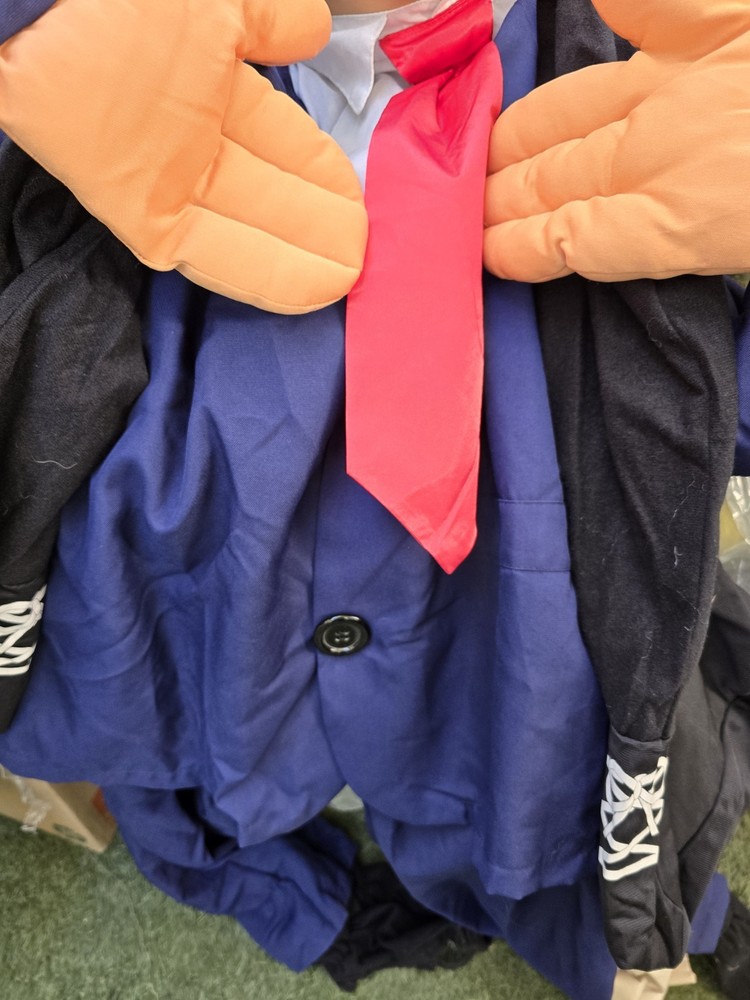 The Donald Trump costume by Morphsuits is a one-piece outfit designed for adults and big kids. It features a multi-color design that mimics the signature style of President Donald J. Trump, including the iconic MAGA hat. This Halloween-themed costume is made in the United States and is perfect for those looking to dress up in a humorous and recognizable outfit. Whether for a fancy dress party or just for fun, this costume is sure to make a bold statement.