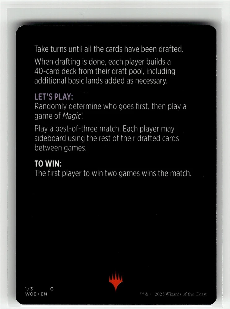 Note: All Listings are for ONE card. The number in the title is the card number. Price: $1.04 Condition: This card was sleeved directly from opening the pack or box and is in mint condition. Mint condition does not apply to centering or refer to grading eventuallities. (Near mint or better) Game: Magic: The Gathering Card Name: Magic Minigame: Winchester Draft Finish: BASE Set: Wilds of Eldraine Set Code: WOE Card Number: 1 Rarity: Special To make it simple, all cards listings are of the same condition. Different conditions are listing under a seperate listing. (See below link for more listings of more conditions if interested): More listings of this card in another condition, different set or different finish/parallel: --- Magic Minigame: Winchester Draft --- More listings from this set: --- Wilds of Eldraine --- All listings from this game: --- Magic: The Gathering --- We highly recommend the upgraded shipping option of "Ground Advantage" if you would like the best protection for your shipping option. Please take serious consideration into benefits of the "Ground Advantage" shipping option. +++ "Ground Advantage" has added weight minimum limitations and dimensions allow us to further protect your cards. +++ "Ground Advantage" bubble mailer adds yet another layer of added security. +++ "Ground Advantage" has better tracking. +++ "Ground Advantage" has more realistic time for delivery estimates and stays within that expected time frame for delivery. - - - A downside is that it is more expensive Our experience with "eBay Standard Envelope for Trading Cards, Stamps, Postcards & Coins up to $20" for your information. - - - "eBay Standard Envelope for Trading Cards, Stamps, Postcards & Coins up to $20" can only provide as much insulation and protection as we are afforded within very limited requirements. - - - "eBay Standard Envelope for Trading Cards, Stamps, Postcards & Coins up to $20" time estimates are best guesses at best (from eBay, not us). - - - "eBay Standard Envelope for Trading Cards, Stamps, Postcards & Coins up to $20" tracking may or may not reflect correctly as it depends on scans in machines and envelope orientation for this machine (USPS, not us). - - - We cannot make any more adjustments for "eBay Standard Envelope for Trading Cards, Stamps, Postcards & Coins up to $20" that will make things more secure, timely, or traceable. +++ The upside is it is more cost effective. ** Note on TCG Pictures: Scans are representations of cards. We scan one card per listing which may or may not be the card that remains or is sent. We have no problem scanning all available cards for you to choose from if you would like to see all available cards for that listing ahead of purchase. Scans are all done with penny sleeves on. If you see scratching and it is labeled as Near Mint, it is from the sleeve. No Near Mint cards will have scratching unless it was missed completely. If it was missed, our team will more than likely catch it on the shipping and notify you before sending. In the case that it is still missed, please notify us for a full return and refund. Scans are done by Commons and Uncommons, by hand. Do not use this as a grading assumption as we are not graders. If you receive your card and don't feel that we have listed it as the condition it was advertised in, feel free to return the card for a full refund no matter the reason. If this is a more expensive card and you would like better, closer, angled, or slightly different scan or picture... feel free to send me a message and we will be happy to pluck all of the variations and send pictures of each. If you receive your card and don't feel that we have listed it as the condition it was advertised in, feel free to return the card for a full refund no matter the reason. We may have labeled it incorrectly. We may have sent the wrong version accidentally. We view the card in a different condition standard than you. ** Note on how to read the title for Trading Card Games (Sports and Novelty Card May be Different). Magic the Gathering = CardName (CardNumber) SetName SetCode (Base/Foil/Special) Condition (ShortGameNameforInventory) eBay Card Condition Guidelines: Please refer to the below link for guidance on how card condition labeling is done. Obviously, this is subjective in nature and these conditions are subjective to begin with. If you are looking for specific conditions for grading purposes, we do not promise any specific grades for cards with any specific conditions. Cards that we have labeled as "NM+" have gone directly into sleeves after opening boxes / packs and were opened by Commons and Uncommons LLC. https://pages.ebay.com/cardconditions/ Shipping Details: All eBay Standard Envelope for Trading Cards can be replaced with other USPS shipping options. This replaces a normal white envelope with a 7 x 9 x 1 bubble mailer. All eBay Standard Envelope for Trading Cards and USPS Ground Advantage can be replaced with expedited shipping. Single Cards Under $20: · eBay Standard Envelope for Trading Cards, Stamps, Postcards & Coins up to $20 (3 to 6 business days). · Cards are sleeved, put into semi-rigid card loaders, and taped to promote moisture resistance, wrapped in packing slip and put into a normal envelope. Multiple cards may go into one loader depending on card type, card thickness and weight. · If special arrangements need to be made so there is no combined shipping, please contact us ahead of the purchase. · Card Saver 1 can be replaced with Top Loaders if desired. There will be an up-charge depending on the card amount purchased. Singly priced cards under $20 in which a combined order is less than $50. · eBay Standard Envelope for Trading Cards, Stamps, Postcards & Coins up to $20 (3 to 6 business days). · We will always attempt to fit larger orders in smaller envelope counts to reduce my shipping costs. · If special arrangements need to be made so there is no combined shipping, please let me know. · Cards are sleeved, 