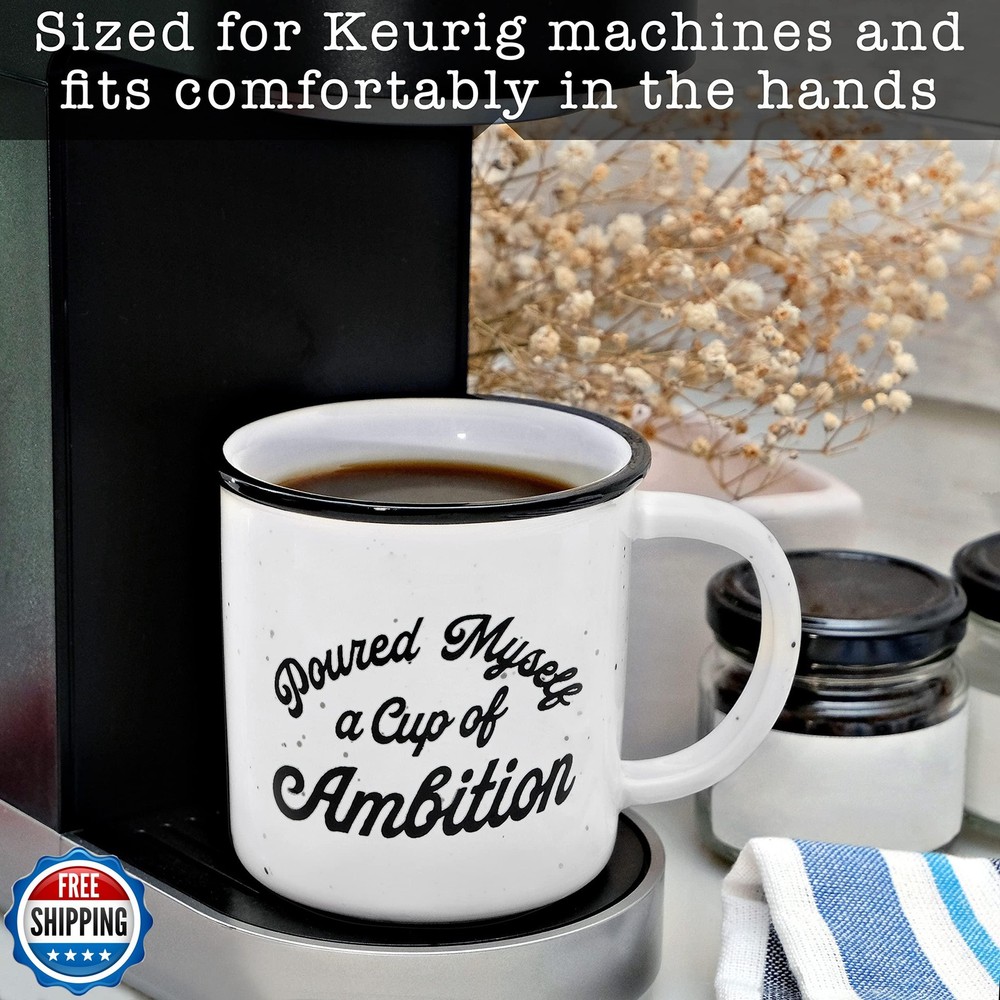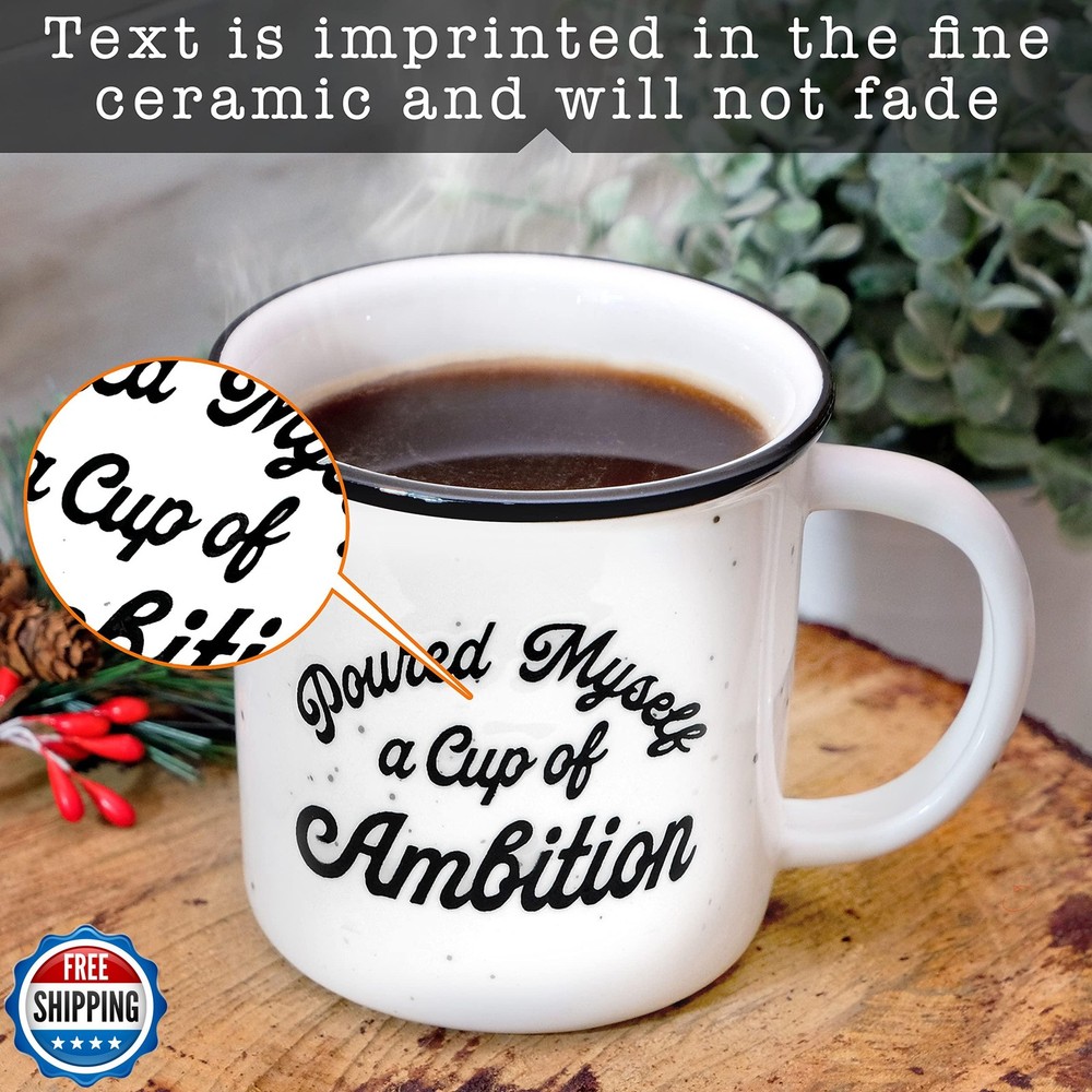 MAINEVENT Pour Myself a Cup of Ambition Mug 11 Oz, Funny Ceramic Coffee Mug Gift for Women Features Express your humor to your friends and loved ones with our Pour Myself a Cup of Ambition mug; Spend quality time with them as you sip your favorite beverage using our coffee mug cup ambition The perfect gift for any occasion, our cup ambition coffee mug makes special events and coffee sessions at home or in the office a lot more enjoyable Imprinted text does not fade on our ceramic mug; Our cup of ambition mug with funny saying will help you get through the week Our microwave-safe, dishwasher-safe ambition coffee mug is made of high-quality ceramic that does not easily break Our cup ambition mug designed in the USA and made with the highest quality and safest materials is an ideal campfire mug for hot and cold drinks Shipping Free & Fast Shipping: We offer free shipping to most of the USA with a normal delivery time of 3-7 days. However, due to the current situation, additional delivery time (up to 3 weeks) may be required for some items. Alternative Carriers: We may use alternative carriers (e.g., USPS, FedEx, UPS) to ensure your package arrives safely and on time. Due to the use of multiple carriers, we are unable to provide a tracking number automatically. Handling Time: Orders are processed and shipped within 1-2 business days of receiving cleared payment. Shipping Restrictions: Shipping to Alaska, Hawaii, Puerto Rico, Guam, and other US territories may incur shipping charges or delivery restrictions. Please contact us before ordering, or your order can be refunded/cancelled. State Restrictions: Certain items may not be shipped to California due to state regulations. Contact for Tracking Updates: If you require tracking updates or have any concerns about the delivery of your order, please feel free to contact us, and we will be happy to assist you. Return Policy 30-Day Hassle-Free Returns: If you are not completely satisfied with your purchase, you can return the item for free within 30 days of receiving it for a full refund or exchange. Easy Return Process: Contact us, and we will provide you with a prepaid return shipping label and detailed instructions. No Restocking Fee: There are no restocking fees for returns. However, the buyer is responsible for return shipping costs if the return is not due to a seller"s error. Refund Processing: Refunds will be processed within 1 business day of receiving the returned item in its original condition. Feedback Your feedback is extremely important to us. We strive to provide the best products and customer service possible. If you are satisfied with your purchase, please take a moment to leave us a positive review. If you have any concerns or issues with your order, please contact us before leaving negative feedback. We are committed to resolving any problems and ensuring your satisfaction. Contact Us If you have any questions or concerns, please feel free to reach out to our customer support team. You can contact us through the eBay messaging system. We are available Monday to Friday, 9:00 am to 5:00 pm EST, and we will do our best to respond to your inquiry within 24 hours. Thank you for supporting our small family business!