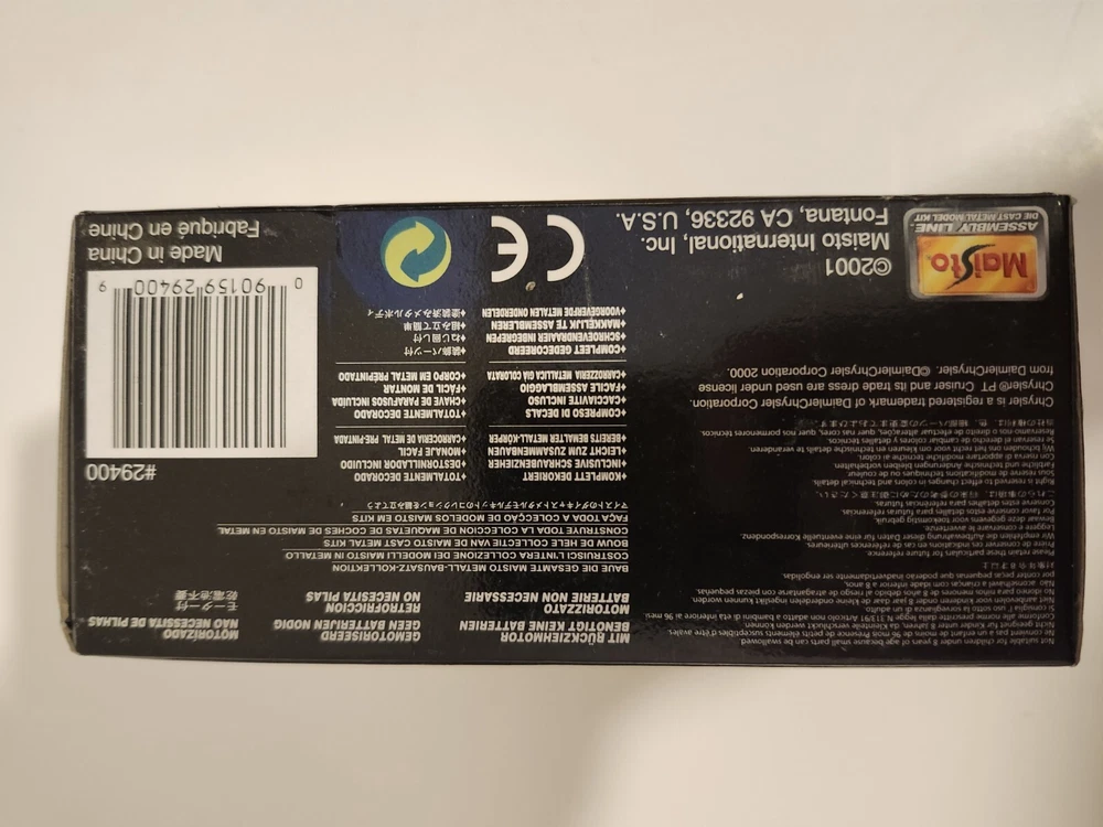 MPN:29400Vehicle Make:ChryslerUPC:090159294009Year of Manufacture:2001Scale:1:43Vehicle Type:CarCountry/Region of Manufacture:ChinaSeries:Assembly Line Die Cast Metal Model KitFeatures:Built From Scratch, Unopened BoxColor:BlackGender:Boys & Girlsgtin13:090159294009Recommended Age Range:8+Brand:MaistoModel:Chrysler PT CruiserVehicle Year:2001Material:DiecastCharacter Family:CarsAutographed:No