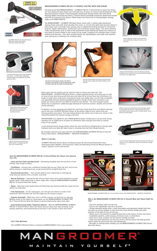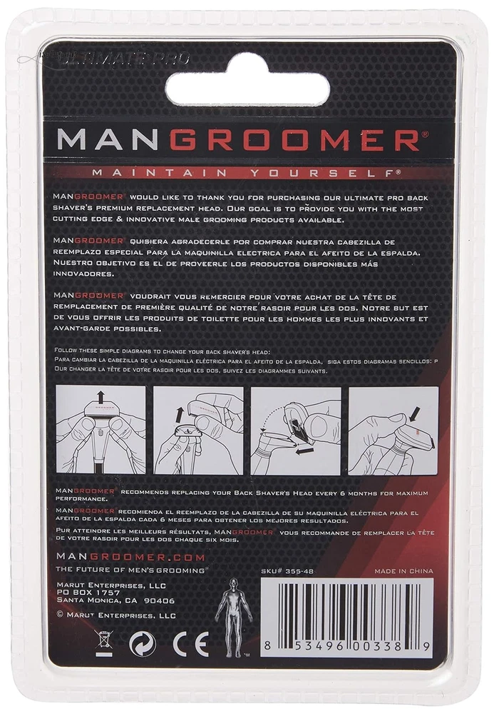 Upgrade Your Shaving Experience with the Ultimate Pro Replacement Blade! Key Features: Exclusively for MANGROOMER : Designed for use with the MANGROOMER Ultimate Pro Back Shaver, this replacement blade ensures you always get the best shave. Cutting-Edge Design : The Ultimate Pro blade offers an extremely close and smooth shave without the risk of ingrown hairs. With a width of 1.8 inches, it covers more area in fewer strokes. Hypoallergenic Stainless Steel : Specifically crafted for sensitive skin, these blades provide a clean, smooth shave every time. Easy Cleaning : Maintain your blade's performance by using the provided cleaning brush or rinsing under running water. Optimal Performance : For the best results, it's recommended to replace your Ultimate Pro Blade every six months. Upgrade your grooming arsenal with the Ultimate Pro Replacement Blade and enjoy a superior shaving experience every time. Introducing the Mangroomer Ultimate Pro Do-It-Yourself Electric Back Hair Shaver for effortless back hair removal. With over ten years of research and development, this is our most advanced back hair shaver ever. Achieve a smooth and hair-free back all by yourself! Explore Our Range : Ultimate Pro Back Shaver Mangroomer Shavers Back Shaver, Ball Shaver, Chest Shaver 2 Shavers in 1 (Rechargeable) Leg Shaver, Underarm Shaver Lithium Max Body Groomer 2.0 Pro Body Groomer Watch Our Product Video : See the product in action Get step-by-step setup instructions Compare multiple products Watch the unboxing experience Why Choose the Ultimate Pro Replacement Blade? Professional Performance : Achieve professional-grade results with the Ultimate Pro's cutting-edge design and optimal 1.8-inch coverage. Hygienic and Easy to Clean : Keep your blade clean and efficient with the included cleaning brush or by rinsing under water. Long-Lasting Durability : Built to last, this blade is made from high-quality materials to ensure a long service life. Product Description: Enhance your grooming routine with the Ultimate Pro Replacement Blade , designed exclusively for the MANGROOMER Ultimate Pro Back Shaver. The advanced blade design delivers an incredibly close and smooth shave, reducing the potential for ingrown hairs. With its hypoallergenic stainless steel construction, it's perfect for those with sensitive skin. How to Replace Your MANGROOMER Shaver Blade: Lightly press upward with your thumbs on the blade, facing the shaver as shown in the picture. Remove the old shaver blade. Align the inner power pin with the center of the new blade's undercarriage. Secure the new shaver blade into place with downward pressure on the back of the head.