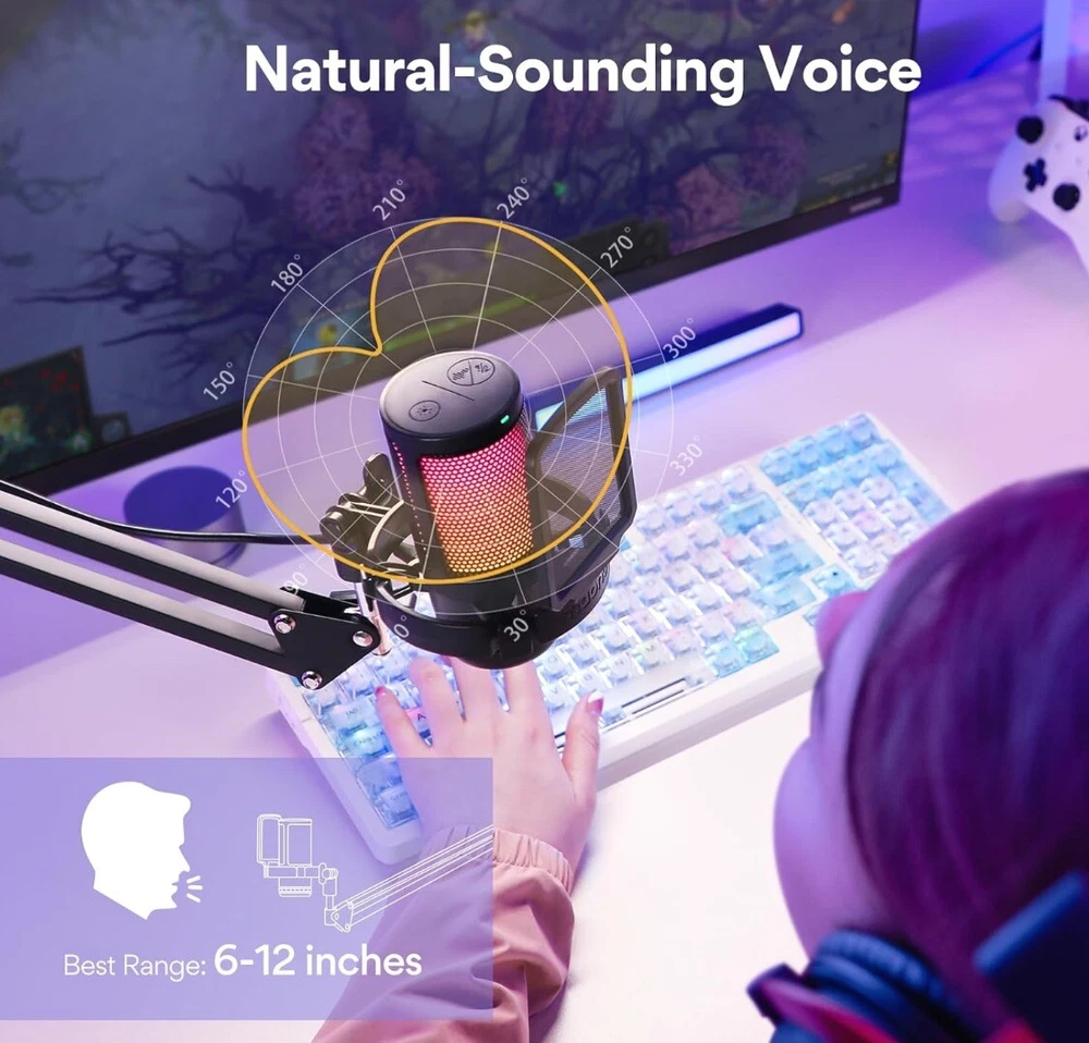 MORE FOCUS AND CLARITY - This gaming microphone with one-click noise cancellation technology, which can effectively eliminate background noise. Whether it's multiplayer online games, cooperative games, or competitive games, the USB microphone can capture game players' voices clearly, thereby enhancing the collaboration and competitiveness of the game. Cardioid pickup focuses more on capturing sound from the mic front, providing better sound quality and accuracy for gaming streaming or voice CONTROLLABLE RGB LIGHTING - You can change the color of RGB lights to match your game streaming aesthetic. The computer microphone has 9 personalized RGB lighting modes, Soft and coordinated lighting effects make your gaming video or gaming live broadcast stand out from the crowd. Long-pressing the RGB button turns off the RGB lights, while a short press turn on the lights and adjusts the light color EASIER MULTIFUNCTION USE - One-click the mute button on top of the PC microphone to turn on mute mode, and you can easily control your game audio. Take control of your on-stream sound with the mic gain knob, you can check if your voice level is too high or too low and adjust accordingly. The zero-latency monitoring allows you to easily maintain professional sound quality with a gaming mic PLUG AND PLAY - The game streaming microphone is compatible with Windows PC computer laptop, Mac, and PS5/4. The gaming USB microphone is ready to capture it when inspiration strikes. Just plug the mic straight into your computer or laptop with the included USB and USB C cable, and you're all set to record or stream, right away, No drivers are required. (Note: Not compatible with XBOX) STURDY & FLEXIBLE ARM STAND - The easy-to-position metal arm stand adjusts to support a variety of setups, You can quickly pull the podcast microphone near your mouth when in use, or fold it away to save more space. The shock mount can further reduce game-induced machine noise and vibration, and the removable pop filter can reduce noise without blocking the gaming computer screen WHAT YOU GET - The USB gaming PC microphone set package includes, USB condenser microphone*1, Metal Boom arm stand*1, Shock mount*1, Pop filter*1, USB and USB C cable*1, Desktop Clamp*1, User's Manual*1