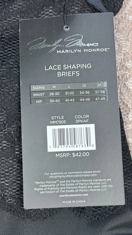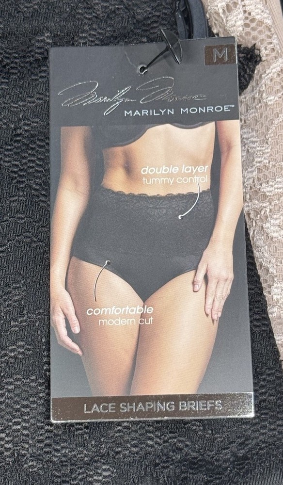 Marilyn Monroe Womens 3 Pack SHAPING BRIEFS LACE DOUBLE LAYER SHAPER MM7305 Beige Black Size M New With Tags! Women’s Size Available: MEDIUM Waist: 28-30” Hip: 38-40” COLOR: Black, Beige STYLE: MM7305 90% Polyester 10% Spandex RETAIL PRICE: $42.00+ Tax Hand Wash Cold Imported