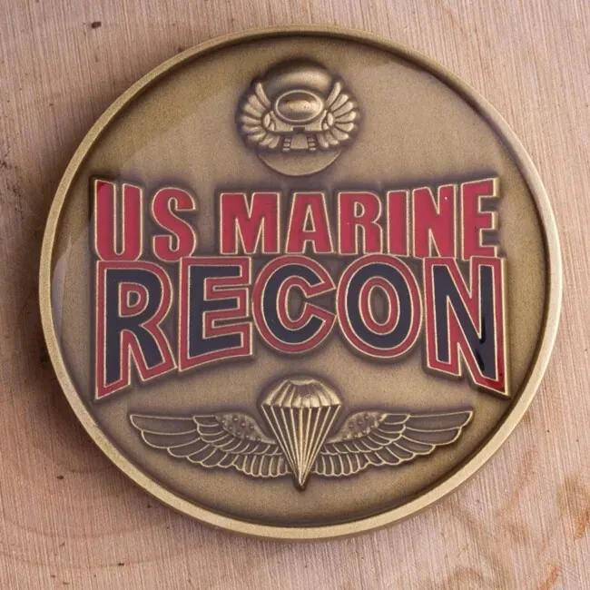 This is a rare 1.75" challenge coin featuring the Marine Corps Recon design. It is a collectible item from the current militaria era (2001-now) and is considered an original item in the category of challenge coins.