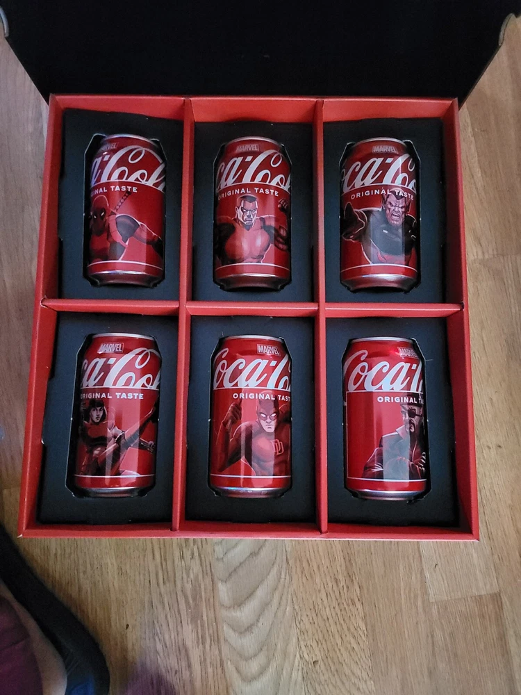 Get your hands on this exclusive MARVEL x COCA-COLA Soda Can Deadpool Collector Set, available only at Walmart! This limited edition set features a stylish design with the iconic Coca-Cola logo and the beloved Marvel character, Deadpool. Made in India, this set is a must-have for any soda or advertising collector. The set includes a 6-pack of Coca-Cola Classic soda cans, each with a unique design featuring Deadpool. This is the perfect addition to any collection, whether you're a fan of the Marvel character or just love collecting unique and rare items. Don't miss out on this amazing opportunity to own a piece of Coca-Cola and Marvel history!