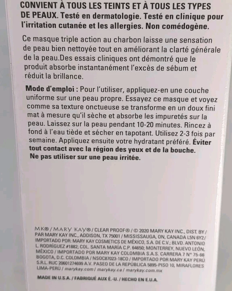 Volume:4 OZ. NET WT. / 114 GSun Protection Factor (SPF):SPF 0gtin13:Does not applySize:RegularIngredients:Glycerin, WaterFeatures:Animal Cruelty-Free, DERMATOLOGIST-TESTED, NON-COMEDOGENICProduct Line:MARY KAY CLEARPROOF DEEP CLEANSING CHARCOAL MASKType:CHARCOAL FACE MASKFormulation:Cream, MaskCountry/Region of Manufacture:United StatesPeriod After Opening (PAO):36MDepartment:UnisexBrand:Mary KaySkin Type:All Skin TypesUPC:Does not applyExpiration Date:CM15Main Purpose:Acne, Clogged PoresMPN:094148UVA Protection:n/aSet Includes:N/AScent:HerbalBody Area:FaceActive Ingredients:Activated Charcoal, Kaolin and Bentonite Clays, Honeysuckle and Navy Bean Extracts