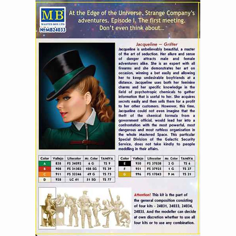 MASTER BOX MB24033 Scale Figure Kit 1:24 Strange Company’s adventures. Episode I. "The first meeting. Don’t even think about...!" - Plastic model kit ---------------------------- If you have a desire to procure a GREATER NUMBER OF ITEMS THAN WHAT IS CURRENTLY DISPLAYED, kindly let us know, and we will happily modify our offerings to suit YOUR EXACT QUANTITY NEEDS. ---------------------------- Scale: 1:24 Manufacturer: Master Box (Ukraine) Country/Region of Manufacture: Ukraine Condition: New in Box Features: Kit Series: Spaceport / Scale Figure Kit Strange Company’s adventures. Episode I. "The first meeting. Don’t even think about..!" in scale 1:24 The kit consists of: - 1 figure The average height of the figures, mm: 75 Figures are not painted Glue and paint are not included The model is suitable for experienced and beginner modelers. ---------------------------- Scale model kits are a great way to create something truly unique and special. Whether you're a beginner or an experienced modeler, we have the perfect kit for you. Our kits are made from high-quality materials and come with detailed instructions, so you can be sure to create a masterpiece. We also offer a variety of accessories and tools to help you customize your model to your liking. With our scale model kits, you can bring your imagination to life. Build your favorite car, plane, or train. Create a replica of your favorite historical figure. Or even build something completely original. No matter what you choose to build, you're sure to have a rewarding and enjoyable experience. So what are you waiting for? Start building your masterpiece today!