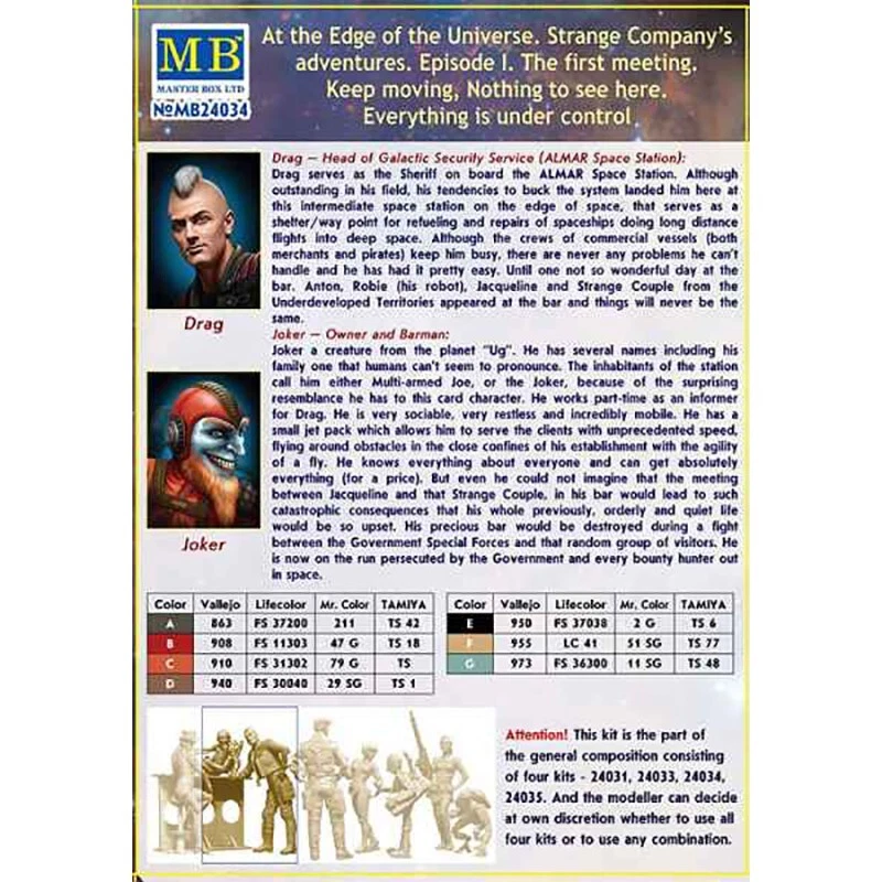 MASTER BOX MB24034 Scale Figure Kit 1:24 Keep moving, Nothing to see here. Everything is under control - Plastic model kit ---------------------------- If you have a desire to procure a GREATER NUMBER OF ITEMS THAN WHAT IS CURRENTLY DISPLAYED, kindly let us know, and we will happily modify our offerings to suit YOUR EXACT QUANTITY NEEDS. ---------------------------- Scale: 1:24 Manufacturer: Master Box (Ukraine) Country/Region of Manufacture: Ukraine Condition: New in Box Features: Kit Series: Spaceport / Scale Figure Kit At the Edge of the Universe. Strange Company’s adventures. Episode I. Keep moving, Nothing to see here. Everything is under control! in scale 1:24 The kit consists of: - 2 figures in different poses The average height of the figures, mm: 75 Figures are not painted Glue and paint are not included The model is suitable for experienced and beginner modelers. ---------------------------- Scale model kits are a great way to create something truly unique and special. Whether you're a beginner or an experienced modeler, we have the perfect kit for you. Our kits are made from high-quality materials and come with detailed instructions, so you can be sure to create a masterpiece. We also offer a variety of accessories and tools to help you customize your model to your liking. With our scale model kits, you can bring your imagination to life. Build your favorite car, plane, or train. Create a replica of your favorite historical figure. Or even build something completely original. No matter what you choose to build, you're sure to have a rewarding and enjoyable experience. So what are you waiting for? Start building your masterpiece today!