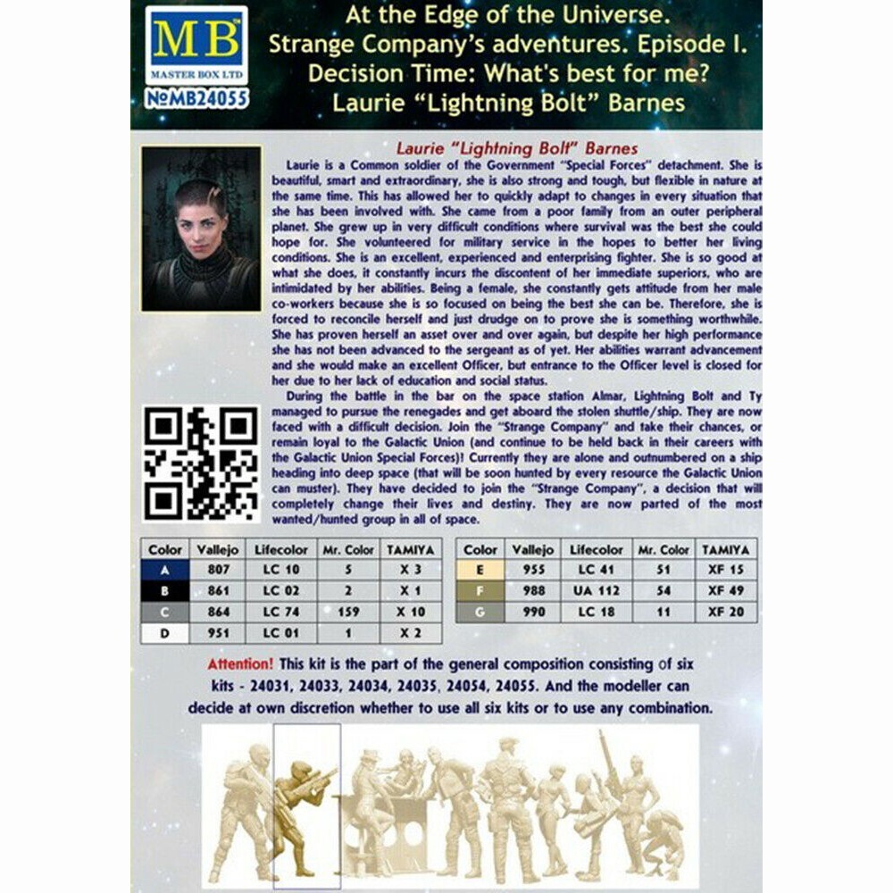 MASTER BOX MB24055 Plastic Figure Kit Scale 1:24 "Laurie “Lightning Bolt” Barnes" - Plastic model kit ---------------------------- If you have a desire to procure a GREATER NUMBER OF ITEMS THAN WHAT IS CURRENTLY DISPLAYED, kindly let us know, and we will happily modify our offerings to suit YOUR EXACT QUANTITY NEEDS. ---------------------------- Scale: 1:24 Manufacturer: Master Box (Ukraine) Country/Region of Manufacture: Ukraine Condition: New in Box Features: Kit Series: Spaceport Series / Scale Figure Kit The kit consists of: - 1 figures Figures are not painted Glue and paint are not included The model is suitable for experienced and beginner modelers. ---------------------------- Scale model kits are a great way to create something truly unique and special. Whether you're a beginner or an experienced modeler, we have the perfect kit for you. Our kits are made from high-quality materials and come with detailed instructions, so you can be sure to create a masterpiece. We also offer a variety of accessories and tools to help you customize your model to your liking. With our scale model kits, you can bring your imagination to life. Build your favorite car, plane, or train. Create a replica of your favorite historical figure. Or even build something completely original. No matter what you choose to build, you're sure to have a rewarding and enjoyable experience. So what are you waiting for? Start building your masterpiece today!