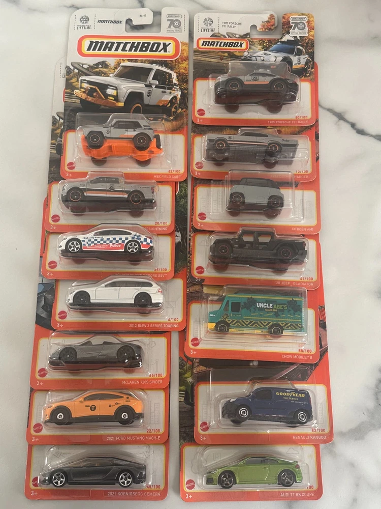 This is a Matchbox diecast metal vehicle set celebrating 70 years of the brand. It includes assorted car, van, and truck models in 1:64 scale. The vehicles are in multi-color designs and come in unopened boxes. The set features special edition and advertising specimen vehicles from various years. Suitable for ages 3 and up, it is a collectible item for both boys and girls.