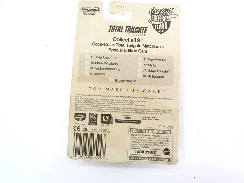 MATCHBOX COCA-COLA FOOTBALL TOWN USA 2004 Humvee ~ Total Tailgate Collection This eBay listing is for a single Mattel Matchbox Coca-Cola Football Town diecast car in 1:64 scale that comes as you see pictured in the listing and noted above. The card is dated 2004. The card do have some shelf wear. I just picked up about 200 pieces of Coca-Cola collectibles including a number of cars, ornaments, watches, tins, etc... If you collect Coca-Cola items like the item above, then be sure to check out my ebay store for more collectibles for sale at this time!! Seller Location Reference - Box 19 BID IN CONFIDENCE – CHECK MY FEEDBACK! My goal is your satisfaction. I leave positive feedback right after the payment is received for all orders!! If you plan to leave anything less than positive feedback and 5 stars - please let me know so that I can work out any problems that you may have. I aim to please!! SHIPPING & HANDLING FOR US BIDDERS We ship ASAP upon payment as noted above within 1 business day 99% of the time!! We normally pack up your new treasures 2 - 3 times a day and ship using USPS and Fedex Ground so that you get your items in a timely fashion. As always - there is no charge for local pickup on any of my items!! SHIPPING AND HANDLING FOR INTERNATIONAL BIDDERS Import duties, taxes and charges are not included in the item price or shipping charges. These charges are the buyer’s responsibility. Please check with your country’s customs office to determine what these additional costs will be prior to bidding/buying.” THANK YOU AND HAVE A WONDERFUL DAY!! Powered by SixBit's eCommerce Solution
