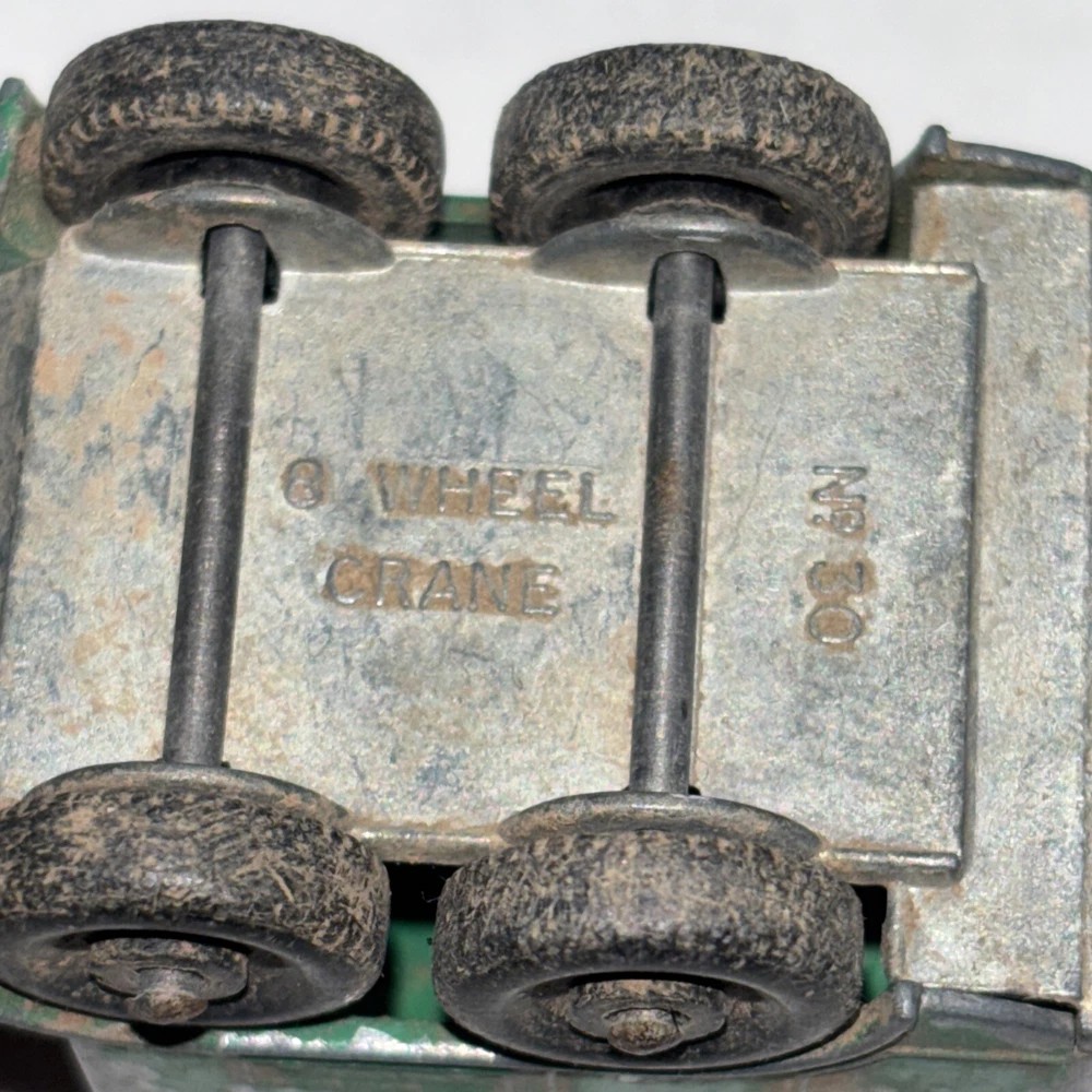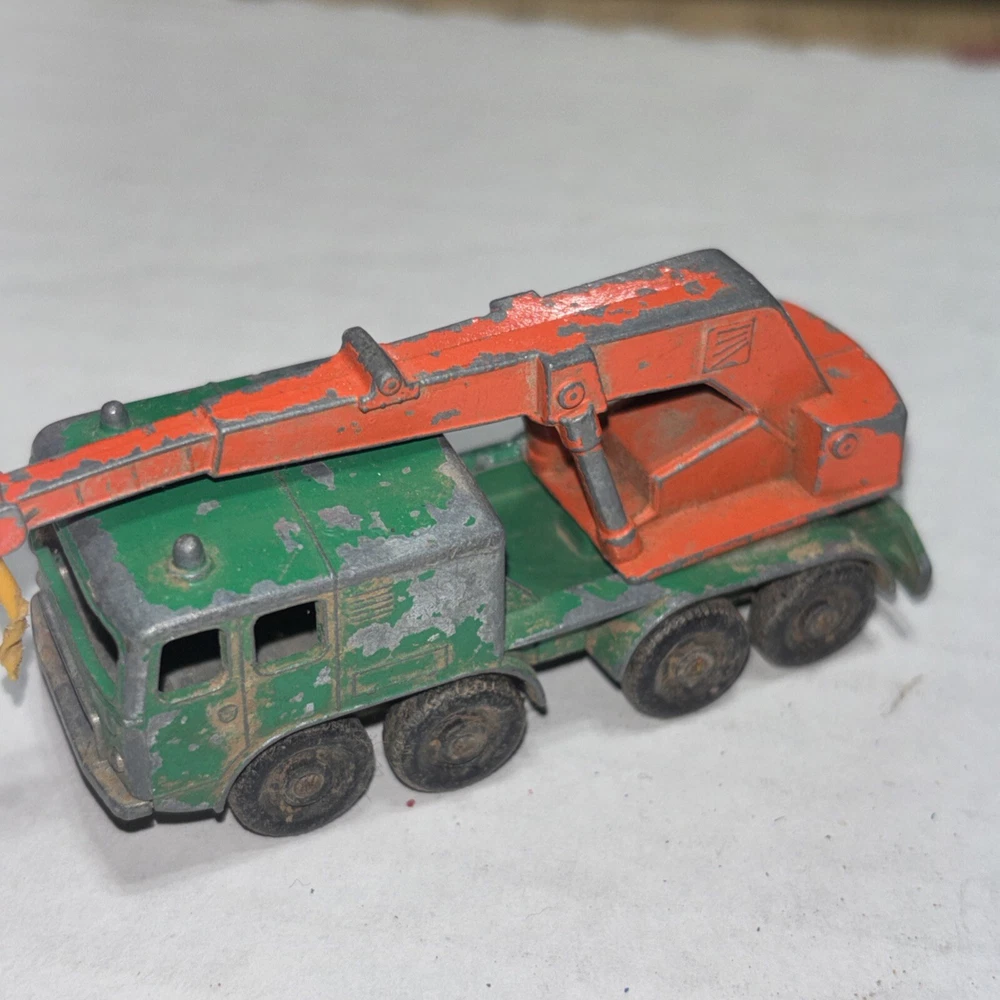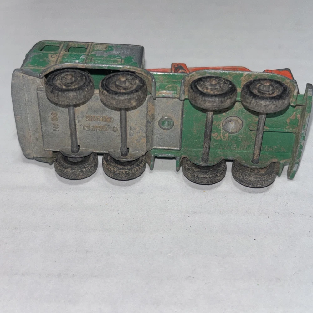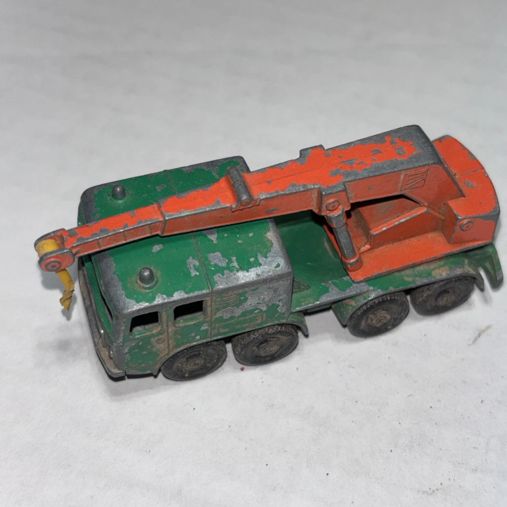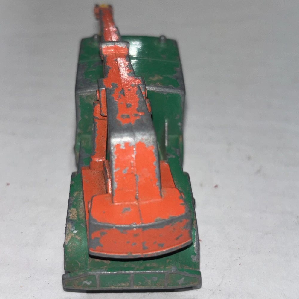 The MATCHBOX Lesney 8 Wheel Crane Truck is a vintage diecast toy car from 1961, part of the Matchbox 1-75 series. It is a 1:64 scale model of a Magirus crane truck in green and orange colors, made of Zamak material. This non-domestic vehicle is designed for children aged 4-7 years old, featuring a construction theme with realistic crane details. This collectible item was manufactured in the United Kingdom and is a classic piece for vintage toy and diecast vehicle enthusiasts.