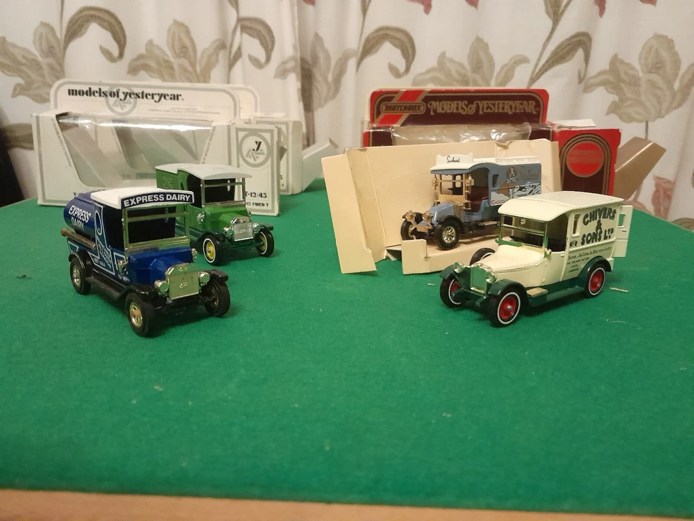 4 X MATCHBOX MODELS OF YESTERYEAR , Y 12 1912 FORD MODEL T 25 YEAR OF MODELS OF YESTERYEAR , Y5 1927 TALBOT CHIVERS & SONS LTD,Y25 1910 RENAULT TYPE AG SUCHARD CHOCOLAT, Y12 FORD MODEL TANKER EXPRESS DAIRY ..ALL IN VERY GOOD CLEAN NO DAMAGE CONDITION. WE WILL COMBINE POSTAGE AND WE CAN DO TWO SETS OF 4 VEHICLES FOR THE ONE LOT OF POSTAGE.