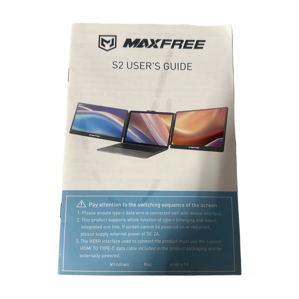 The MAXFREE S2 Portable 14" Triple Monitor Laptop Screen Extender offers a 14-inch screen size with Full HD 1080p resolution and a 16:9 aspect ratio. It features a bright display with 300 cd/m² brightness and a quick 1ms response time, suitable for gaming and productivity tasks. With HDMI Mini video inputs and IPS LCD technology, this Maxfree monitor provides clear visuals and a 1000:1 contrast ratio. It boasts dual monitor functionality and portability, making it a convenient option for expanding your laptop screen workspace.