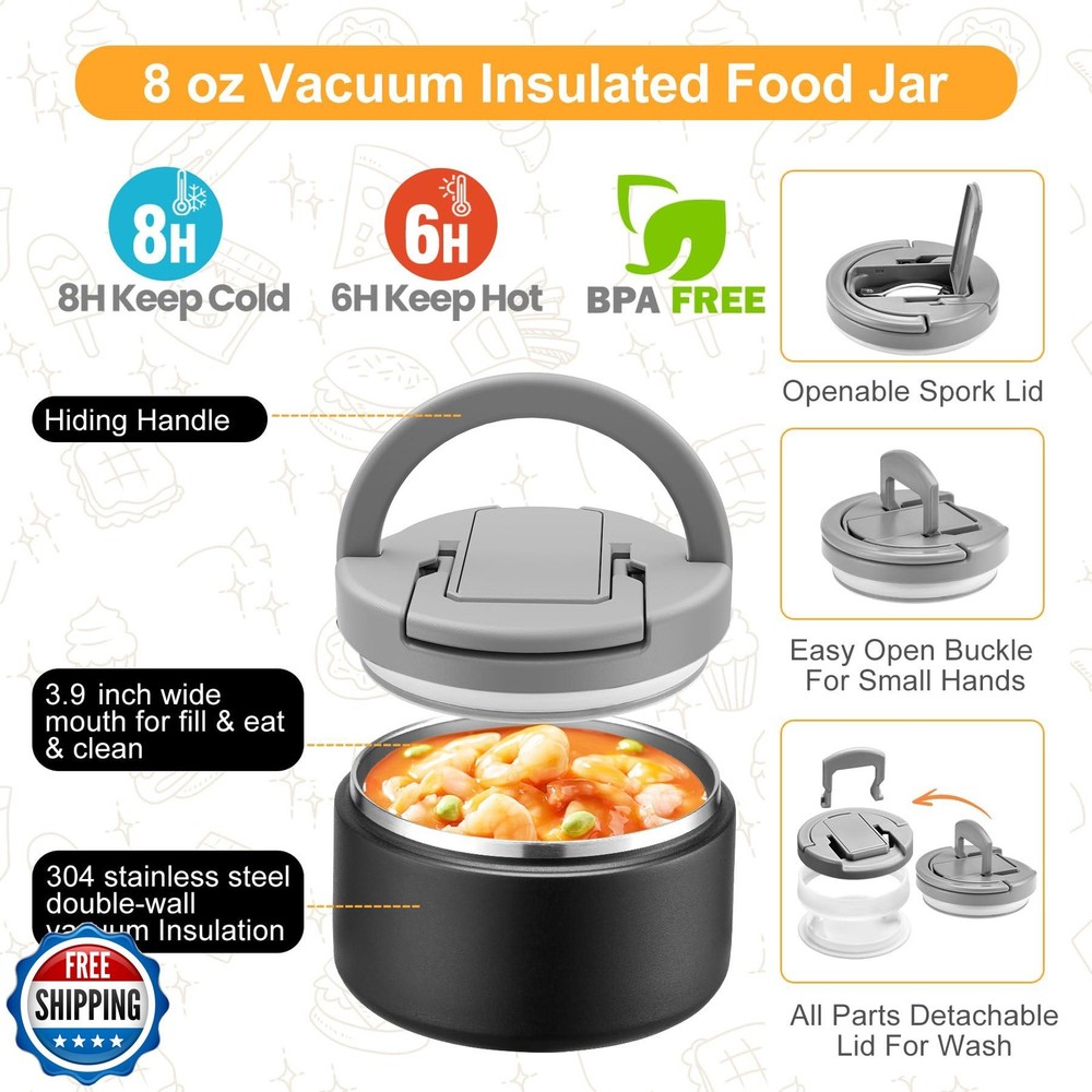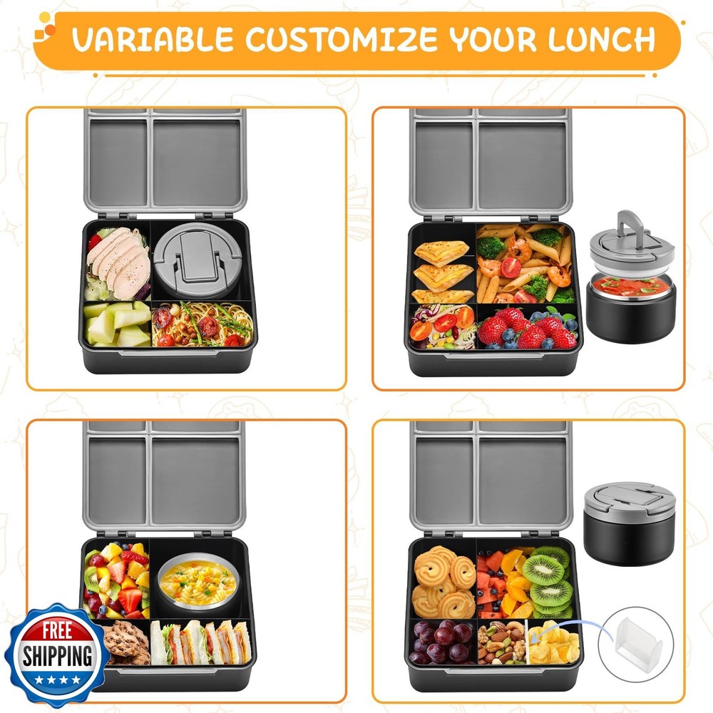 MAXSO Bento Lunch Box Set for Kids with 8 oz Soup Thermo, Leakproof Hot Food Container with 4 Compartments, Insulated Food Jar for Toddler Daycare Boys Girls School - Black Features Kids Lunch Bento Boxe Set - 100% Leakproof: Each compartment is individually sealed to prevent mess leakage. Kids-friendly latch on the box and buckle structure lid of 8oz soup thermo are designed for little hands to open and close easily. Perfect gift for kids & toddler pack lunch to daycare, nursery, preschool, kindergarten, elementary school, picnic or camping 8oz Vacuum Insulated Soup Thermo: Food grade 304 stainless steel and double wall vacuum insulated technology, our soup thermo can keep food warm or cold for up to 5 hours. The build-in stainless steel spork carry and eat easily for kids Food Grade Material: This bento lunch box set is entirely made of food grade materials, which is durable and BPA free, providing the highest safe level to protect kids’ health. 4 compartments seals well to effectively prevent leakage and smell-mixing Easy to Clean: This kids bento box is microwave safe & dishwasher safe for your convenience. The rubber sealing ring of lunch boxes and the lid of insulated food jar are both detachable to clean. The wide mouth thermo container is also convenient to clean both by hand or dishwasher Warm Tips: In order to keep food hot or cold longer, we suggest to preheating or precooling with hot wateror icy water for 5~10 minutes before adding food or soup. We focus on kid's food safety and committed to provide safe and excellent products for kids. Any questions, please contact us immediately Shipping Free & Fast Shipping: We offer free shipping to most of the USA with a normal delivery time of 3-7 days. However, due to the current situation, additional delivery time (up to 3 weeks) may be required for some items. Alternative Carriers: We may use alternative carriers (e.g., USPS, FedEx, UPS) to ensure your package arrives safely and on time. Due to the use of multiple carriers, we are unable to provide a tracking number automatically. Handling Time: Orders are processed and shipped within 1-2 business days of receiving cleared payment. Shipping Restrictions: Shipping to Alaska, Hawaii, Puerto Rico, Guam, and other US territories may incur shipping charges or delivery restrictions. Please contact us before ordering, or your order can be refunded/cancelled. State Restrictions: Certain items may not be shipped to California due to state regulations. Contact for Tracking Updates: If you require tracking updates or have any concerns about the delivery of your order, please feel free to contact us, and we will be happy to assist you. Return Policy 30-Day Hassle-Free Returns: If you are not completely satisfied with your purchase, you can return the item for free within 30 days of receiving it for a full refund or exchange. Easy Return Process: Contact us, and we will provide you with a prepaid return shipping label and detailed instructions. No Restocking Fee: There are no restocking fees for returns. However, the buyer is responsible for return shipping costs if the return is not due to a seller"s error. Refund Processing: Refunds will be processed within 1 business day of receiving the returned item in its original condition. Feedback Your feedback is extremely important to us. We strive to provide the best products and customer service possible. If you are satisfied with your purchase, please take a moment to leave us a positive review. If you have any concerns or issues with your order, please contact us before leaving negative feedback. We are committed to resolving any problems and ensuring your satisfaction. Contact Us If you have any questions or concerns, please feel free to reach out to our customer support team. You can contact us through the eBay messaging system. We are available Monday to Friday, 9:00 am to 5:00 pm EST, and we will do our best to respond to your inquiry within 24 hours. Thank you for supporting our small family business!