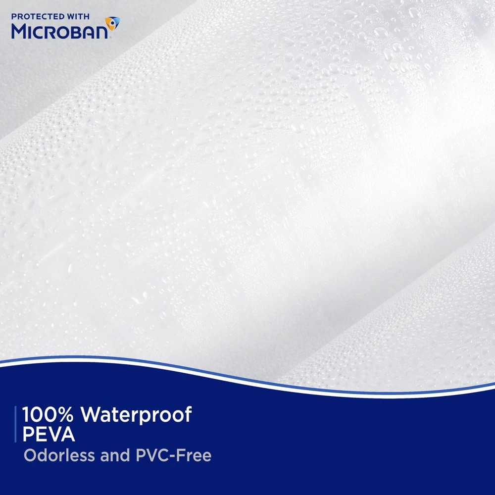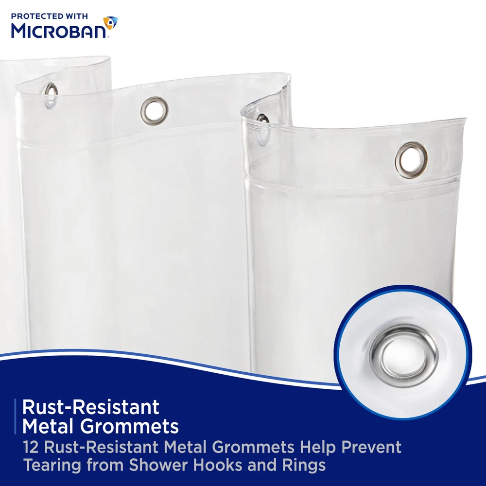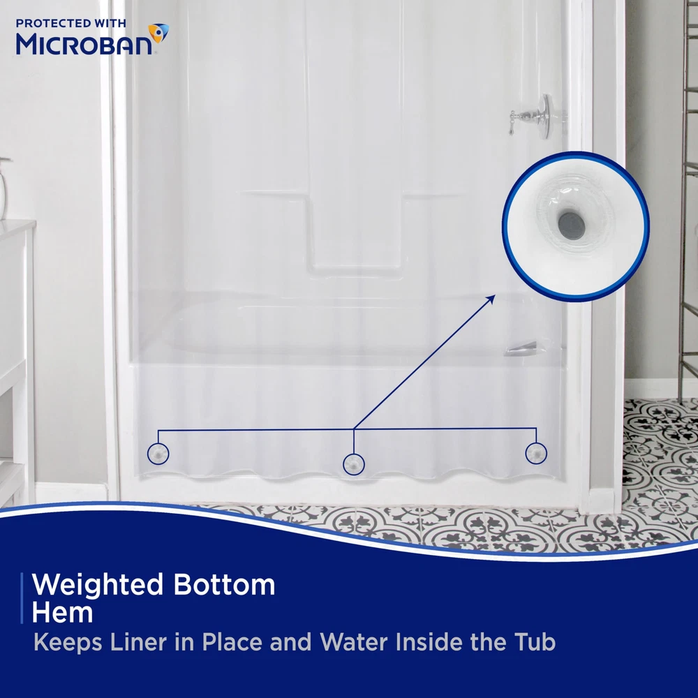 The Heavyweight PEVA Shower Liner Protected with Microban antimicrobial technology inhibits the growth and reproduction of odor-causing bacteria, mold and mildew and provides enhanced product protection from microbes. Microbes can cause staining and noxious odors – less microbes equals a fresher product! Protected with Microban, this Shower Liner will remain antimicrobial for the expected product lifetime – the antimicrobial properties will not wear off or wash away. The Shower Liner is made of environmentally friendly PEVA, making it PVC-free and odorless. The liner has 12 rust-resistant metal grommets to prevent tearing from shower hooks and rings. The weighted hem on the waterproof liner keeps the liner from billowing and in place. Standard sized, this liner measures 70 inches wide by 72 inches tall (178 cm x 183 cm) to fit most showers and bath tubs. Protected with Microban: The Microban additive inhibits the growth of stain and odor-causing bacteria, mold and mildew, and provides enhanced product protection Antimicrobial & Mildew-Resistant Product: Products stay cleaner in-between cleanings, complementing existing cleaning practices Built-in Lifetime Performance: Products remain antimicrobial for their expected lifetime – the properties will not wear off or wash away Reduces Odor-Causing Bacteria: Microbes can cause staining and noxious odors – less microbes equals a fresher product Eco Friendly: Heavyweight PEVA shower liner is PVC-free, environmentally friendly, and odorless Rust-Resistant Metal Grommets: Enhanced strength is resistant to tears Weighted Bottom Hem: Keeps liner in place and water inside the tub Standard Size: 70" W x 72" H (178 cm x 183 cm) fits most bath tubs and showers