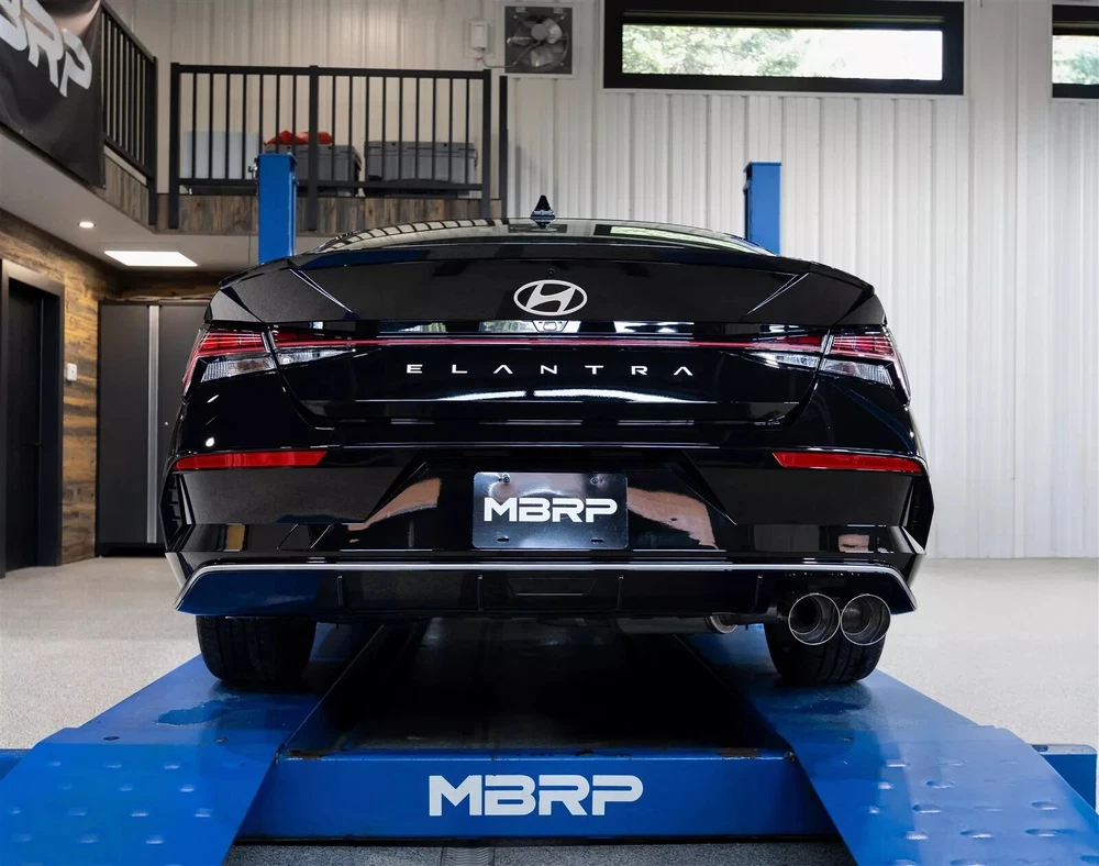 MBRP 3" Axle-Back Exhaust System For: 2021-2024 Hyundai Elantra N-Line 1.6L Turbo Details: 3" Aluminized Steel 4" Polished Stainless Tips Included 47% Flow Increase Boosts Horsepower & Torque Can Improve Fuel Economy by 1-2 MPG 3 Year Warranty Street Profile - It’s the perfect mix of aggressive sound when you’re into the throttle without being obnoxious on long drives.
