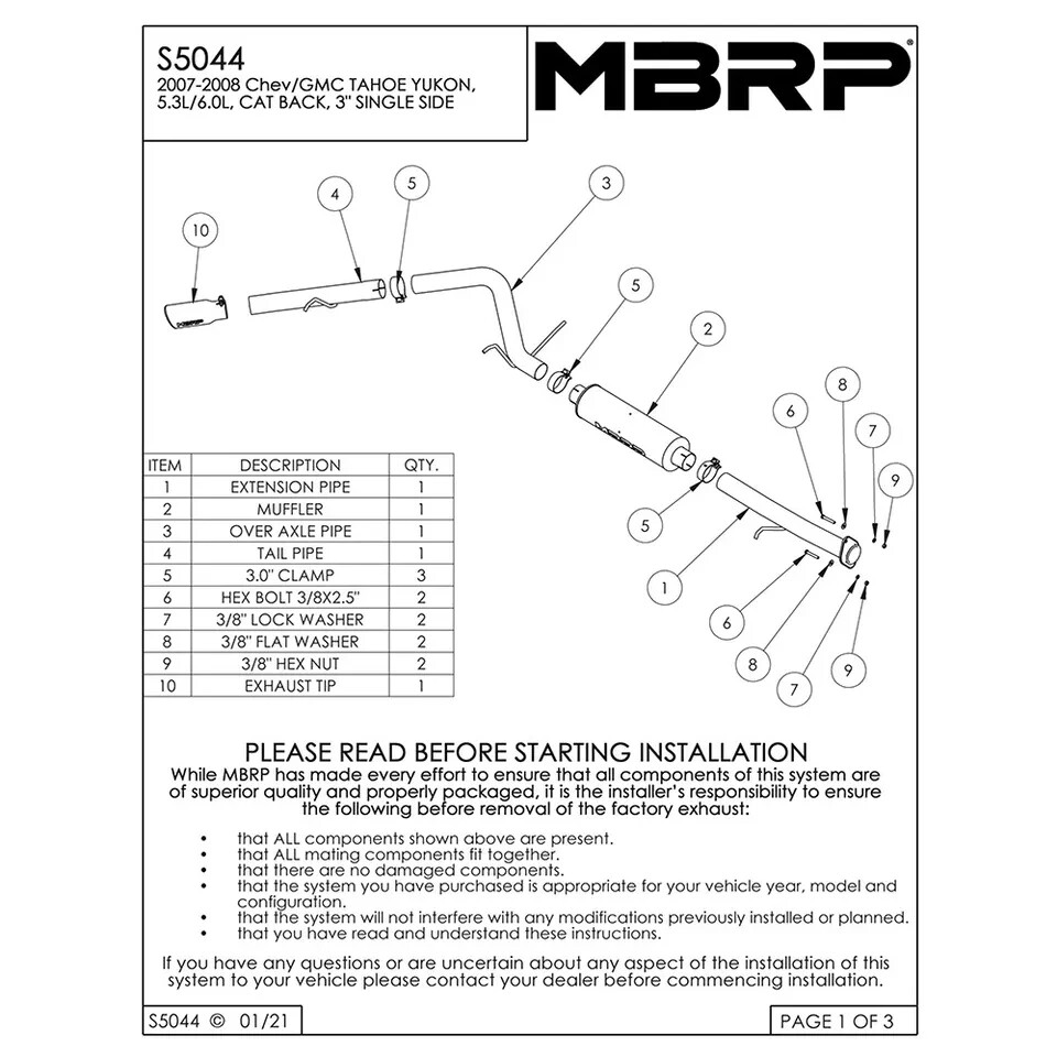MBRP S5044AL 3" Cat-Back Exhaust for 2007-2008 Chevy Tahoe / GMC Yukon 5.3L V8