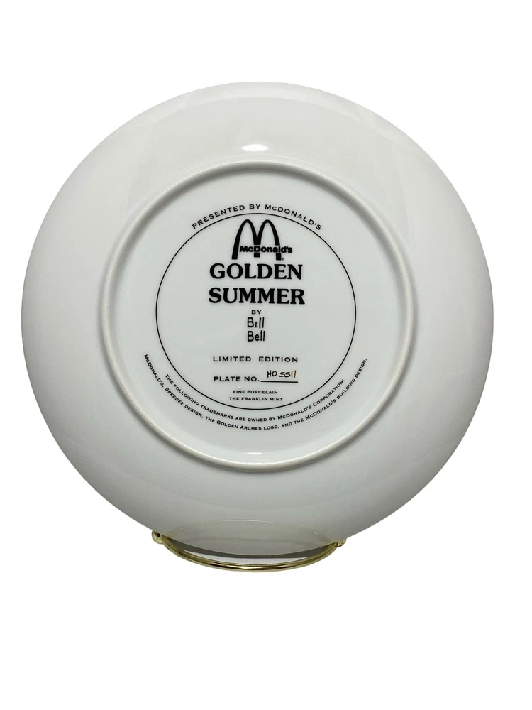 This collectible porcelain plate from Franklin Mint features a charming design of Mcdonalds' Golden Moments by artist Bill Bell. The plate showcases the iconic theme of Mcdonalds in the 1990s, making it a must-have item for any collector of advertising memorabilia or fast food-related items. The plate is in excellent condition, free from any noticeable marks or blemishes. It is perfect for display or everyday use and would make a great addition to any Mcdonalds merch collection. New in styrofoam. Please review pictures. Plate stand included that comes with plate. If you have any questions please feel free to ask. Thanks Combine shipping. Absolutely. Please feel free to ask. Thanks