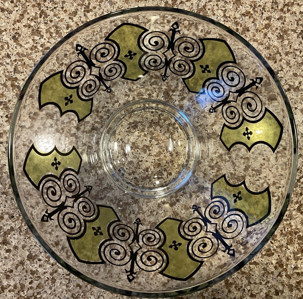 Elevate your serving game with this stunning vintage MCM Anchor Hocking Espana Butterfly Serving Bowl. The multicolor design features a beautiful butterfly pattern that will captivate your guests and add a touch of elegance to any occasion. Made of high-quality glass, this serving bowl is perfect for hosting dinner parties, family gatherings, or even daily meals with your loved ones. Its unique product line and vintage appeal make it a must-have addition to your collection. This is in VERY GOOD condition, pattern seems to be fluid throughout bowl. Very heavy solid piece with thick glass base, which makes shipping slightly higher.
