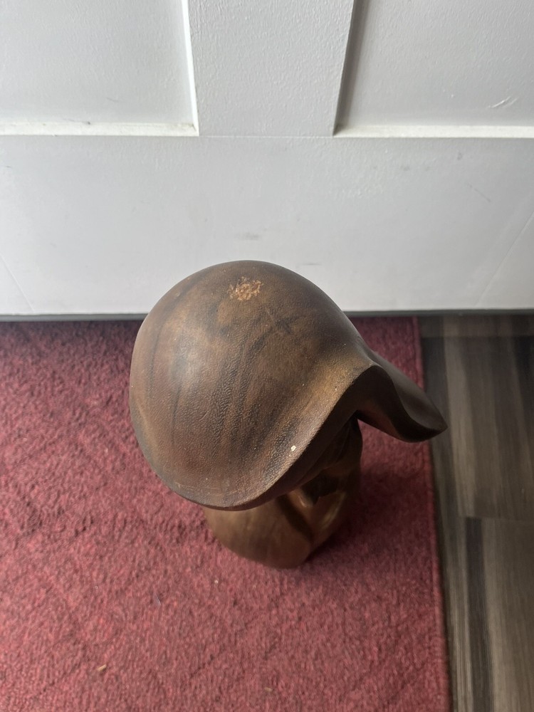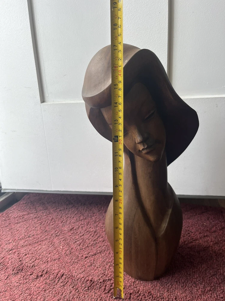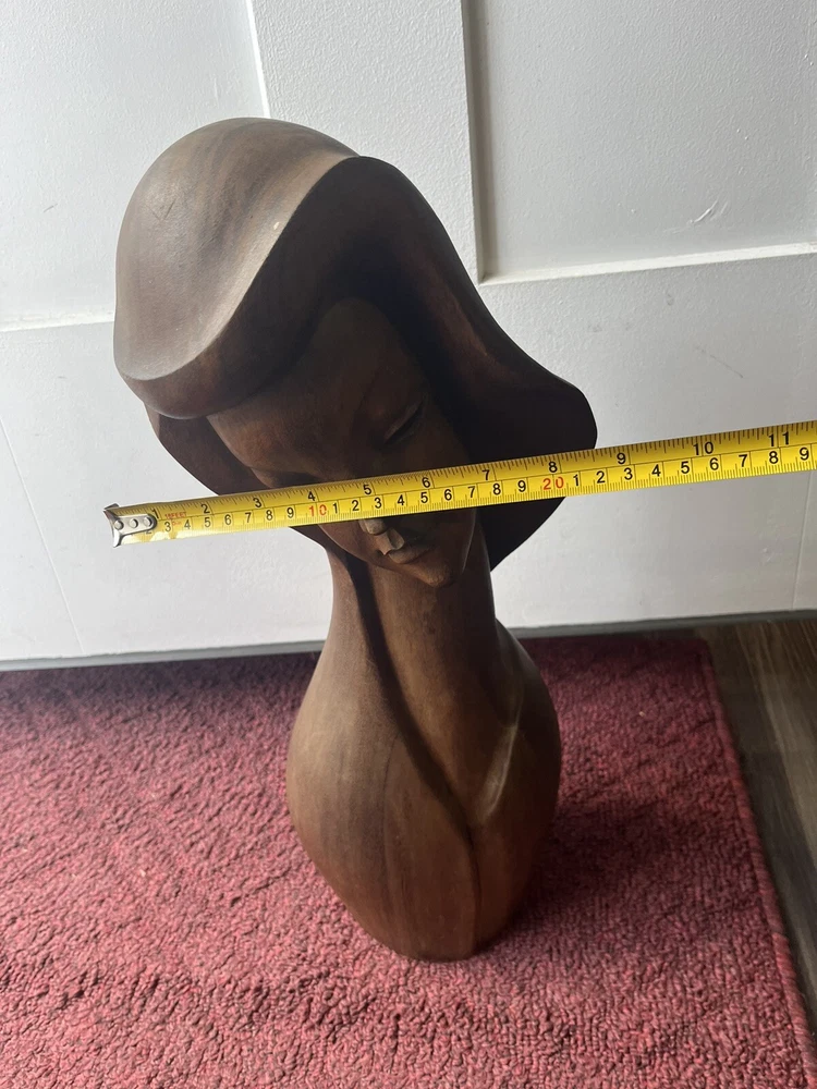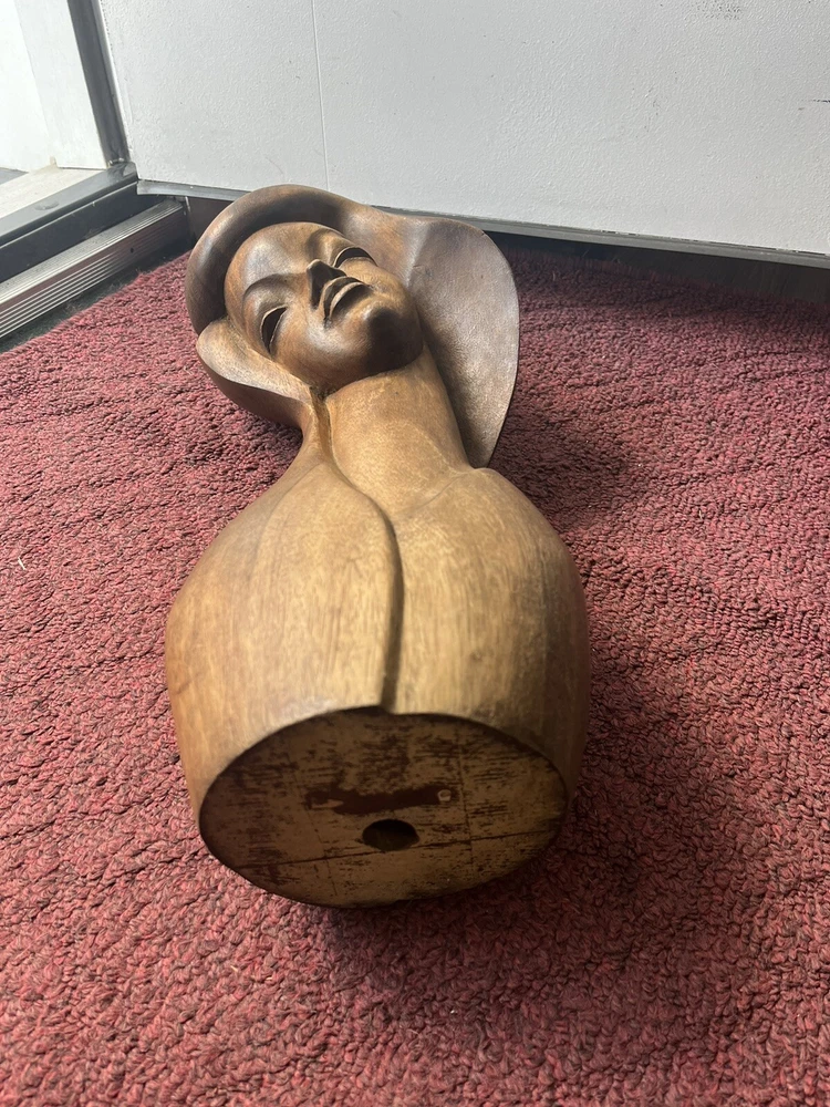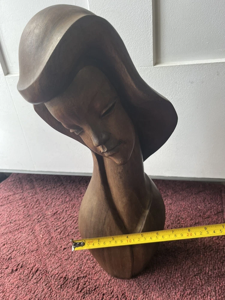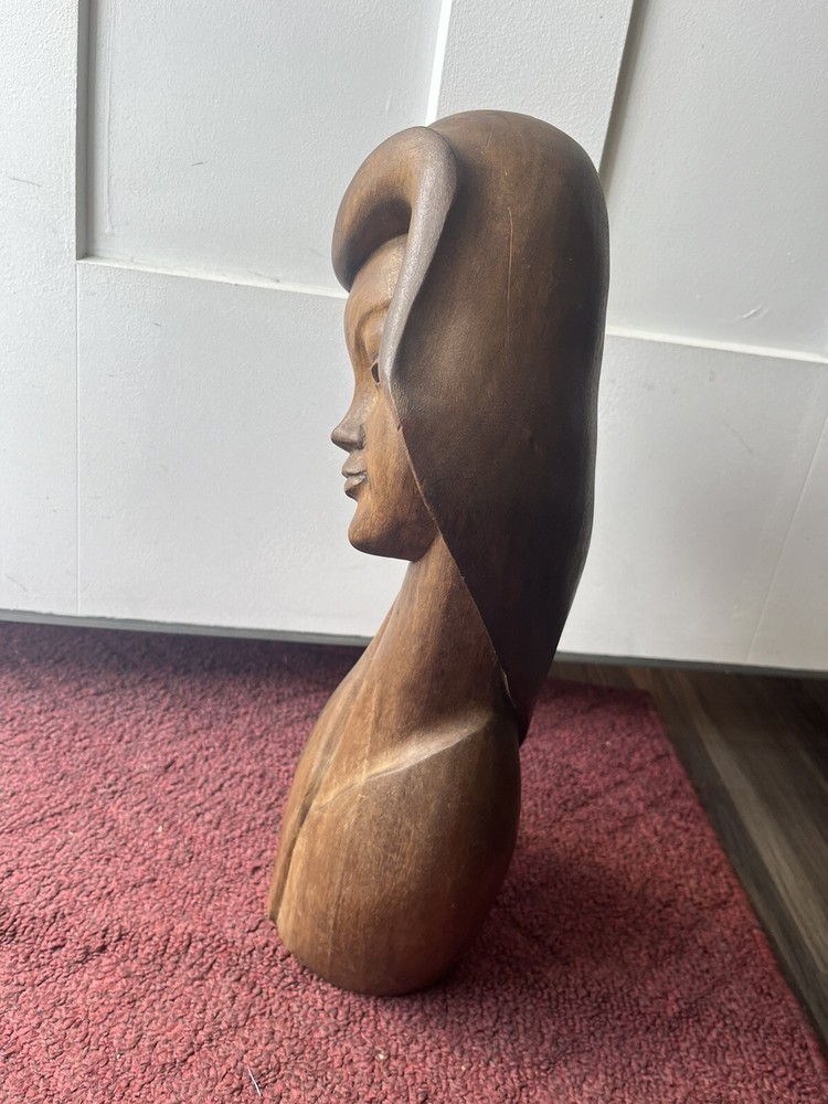 This vintage Mid-Century Modern Art Deco style bust of a woman is a stunning piece of carved wood art. The beautiful craftsmanship brings to life the striking features of a woman's face, making it a unique addition to any art collection. The use of wood as the material adds to the beauty and uniqueness of the piece. This exquisite bust is perfect for art lovers and collectors, and is sure to add a touch of elegance to any room. Preowned it shows minor signs of age some chipping of the wood at the top of her head She is 18 inches tall and 8 inches wide Please refer to pictures before making your purchase