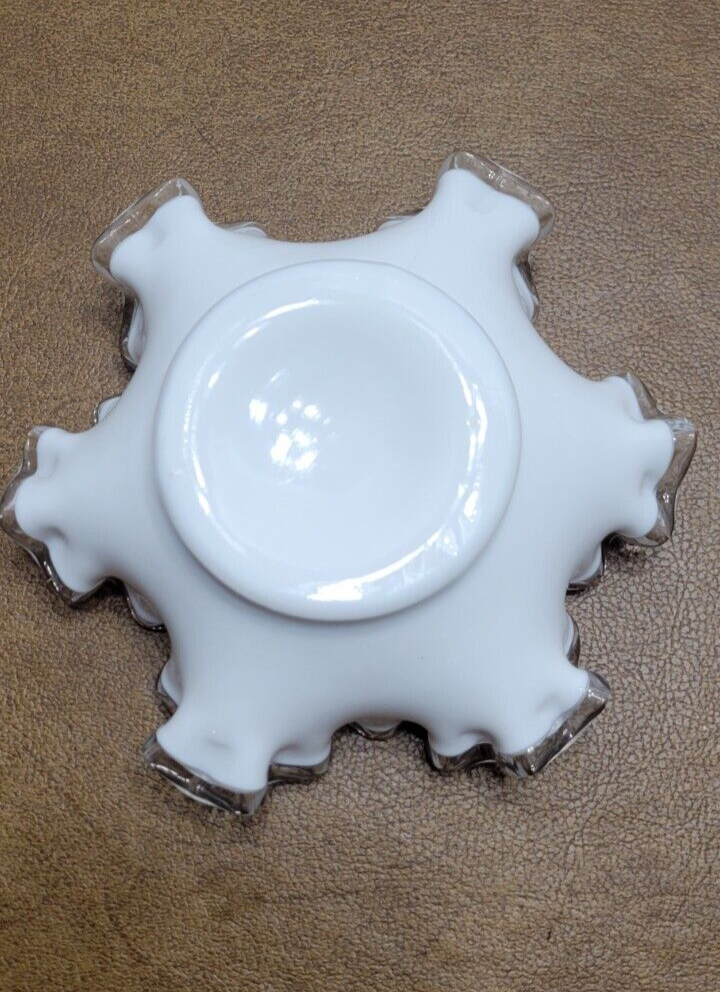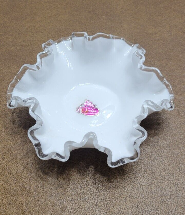 The MCM Fenton Silver Crest Milk Glass Candy Dish is a vintage piece featuring a clear ruffled edge and a bon trinket design. This candy dish is from the Mid-Century Modern era and is made of high-quality glass material, specifically milk glass. The Fenton brand is known for its production of unique glassware, and this candy dish is a beautiful example of their craftsmanship. Perfect for displaying candies or trinkets, this vintage piece adds a touch of elegance to any home décor.