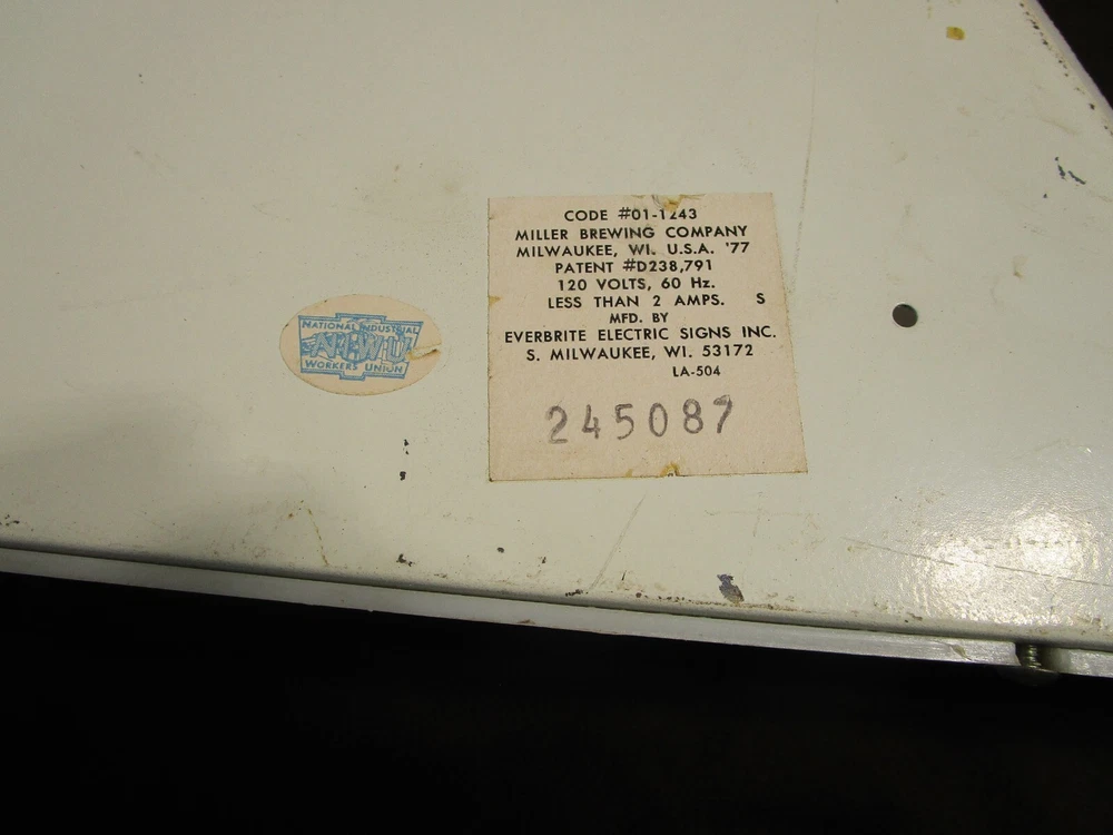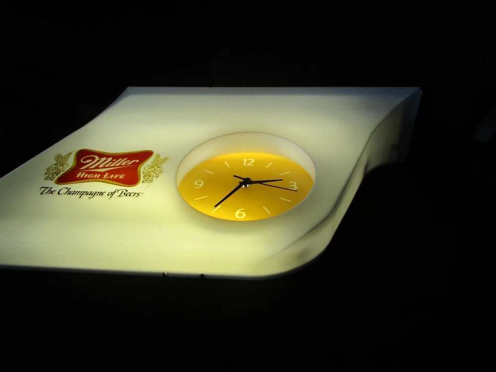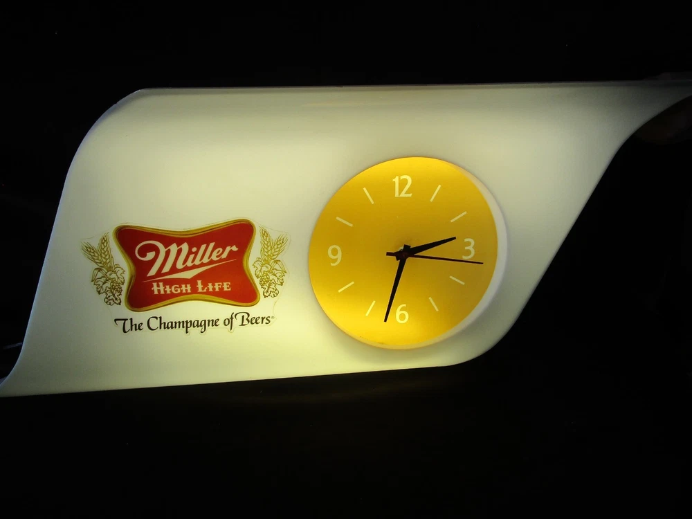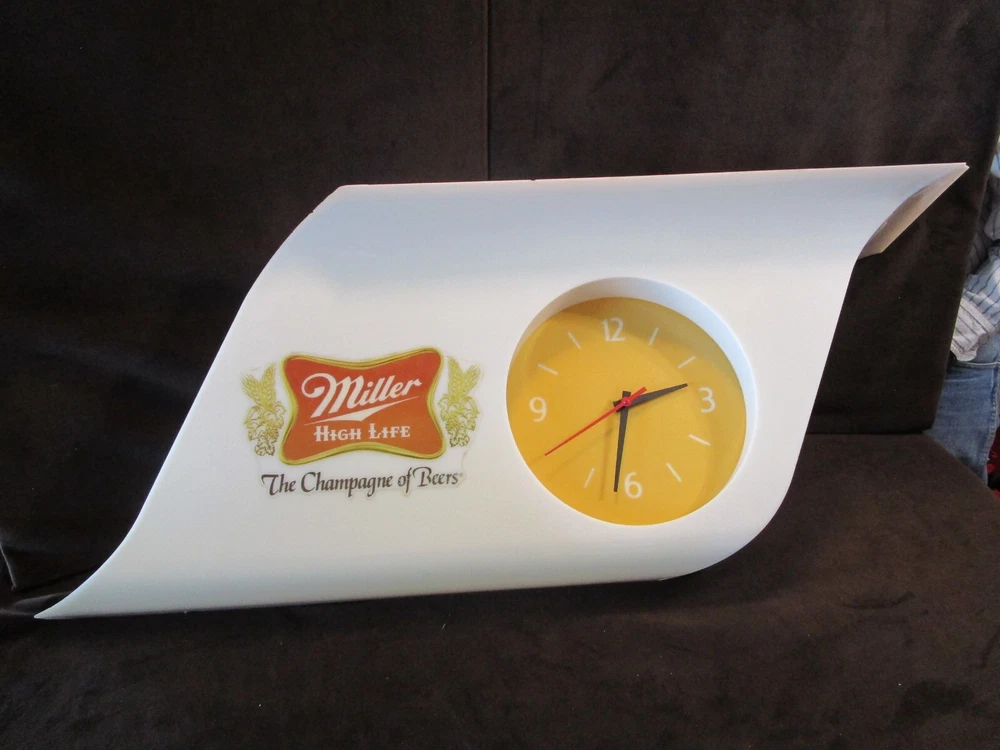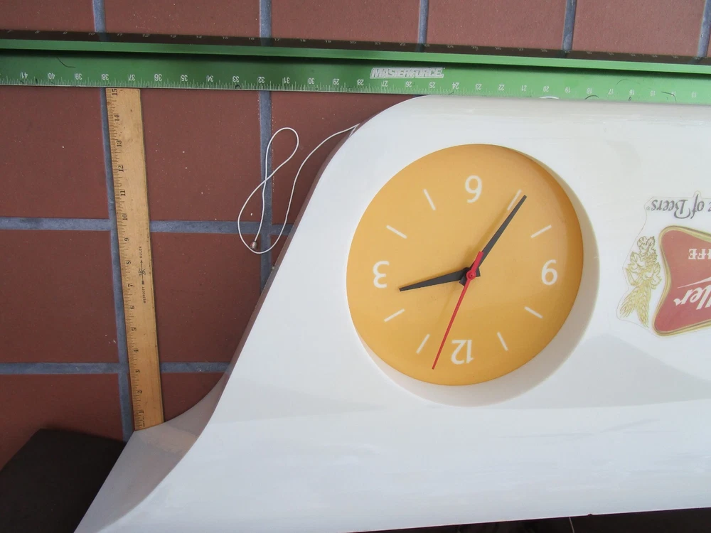 Description: 20/44/21/16 Book # 311 Mid Century Modern SHARK FIN Miller High Life Champagne of Beers Lighted Clock & Sign. Circa 1977 – Milwaukee Wisconsin USA Made by EVERBRITE Electric Signs Inc. in Wisconsin- Working Clock 10” across- with minute hand present and working. It is 38” wide x 15” tall and 7.5” deep Flat area on top is 24” W x 7.25” deep Unpacked weighs 10 pounds Pull cord light switch on the bottom turns the lights ON and OFF, but clock runs as long it is plugged in. Non- polarized 2 prong outlet on top Clock and lights are working, used bulbs included but not guaranteed to survive shipping. Nice vintage condition- Clean, no cracks or breaks, one chip on the upper corner to the right, and some fleabites to edges. Please zoom and view all pictures as they are part of the description. Email me with any questions you may have. I DO MY BEST TO DESCRIBE EVERY LISTING BUT I AM NOT AN EXPERT AND ITEMS ARE SOLD “AS IS”. My idea of great/good may be different than yours, so EXAMINE PHOTOS CAREFULLY since they are binding and a supplement to the word description in case, I should miss something. If I fail to mention something, it does not qualify as “item not as described” if it shows in my pictures. EACH PHOTO IS WORTH A THOUSAND WORDS AND THEY ARE OF THE EXACT ITEM YOU WILL RECEIVE. RETURN POLICY: Returns are acceptable ONLY if the item is defective, or grossly misrepresented. THIS MEANS I DO NOT ACCEPT RETURNS FOR FIT, SIZING, COLOR ISSUES, OR BUYER'S REMORSE. Please note: Buyer pays all return shipping and fees. · FEEDBACK I do not leave a feedback until the end of a transaction. The transaction is considered over once I receive feedback from you confirming that you have received it and expressed satisfaction with it. If you are unsatisfied with your purchase, please contact me before leaving a neutral or negative feedback- so I can fix the issues. Thanks again for shopping at our EBay store and look forward to serve you. Postage is fully tracked Email me with any questions. No reasonable offer refused.