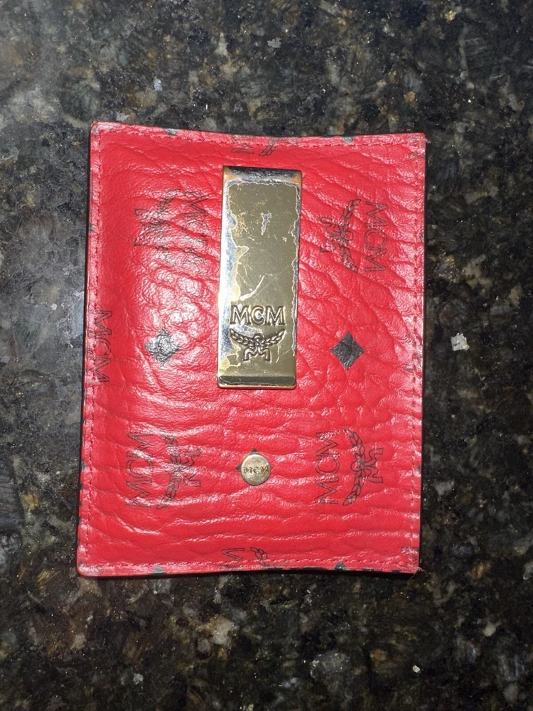 MCM Wallet With Money Clip (Gold) Red Color. No box or papers with it anymore because I thought I would want to keep it but it’s just collecting dust and the leather is still nice ! Money clip is just rough rn but still a nice little wallet!