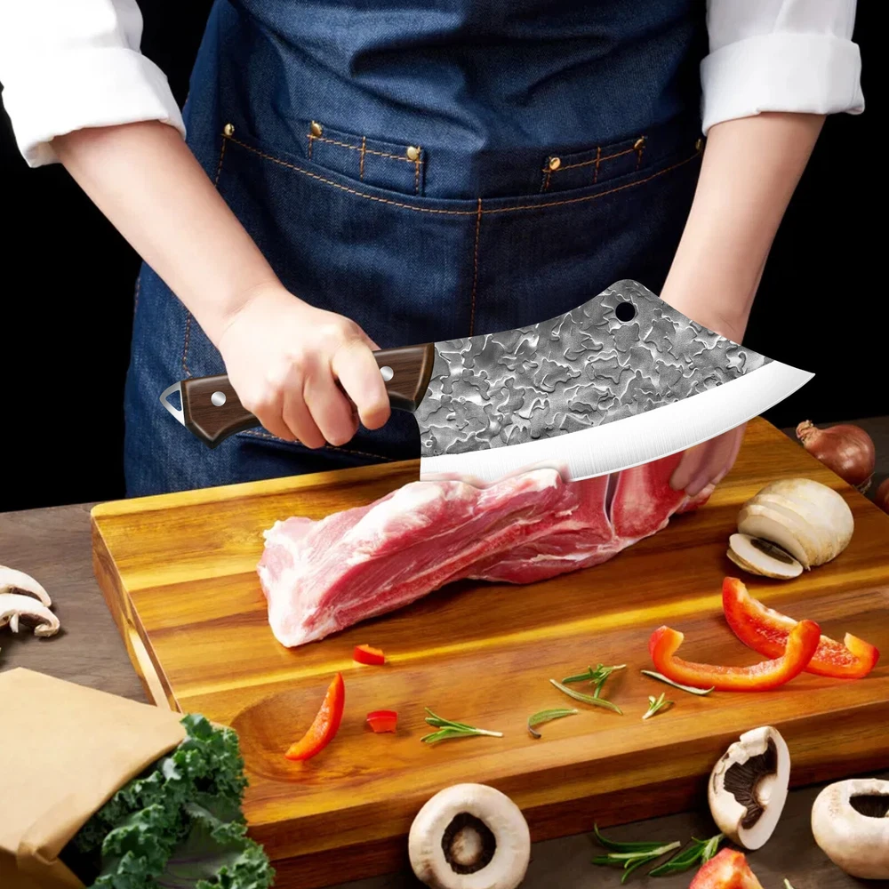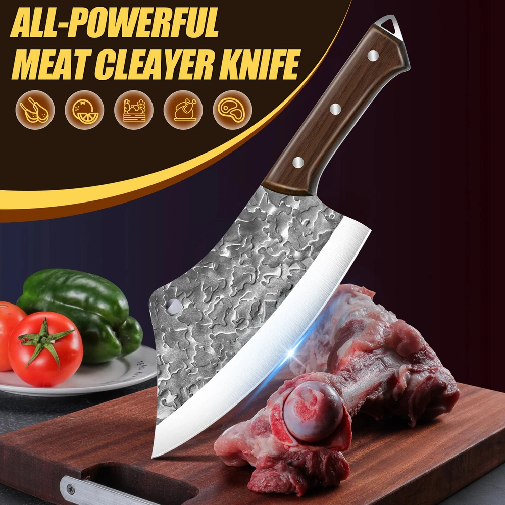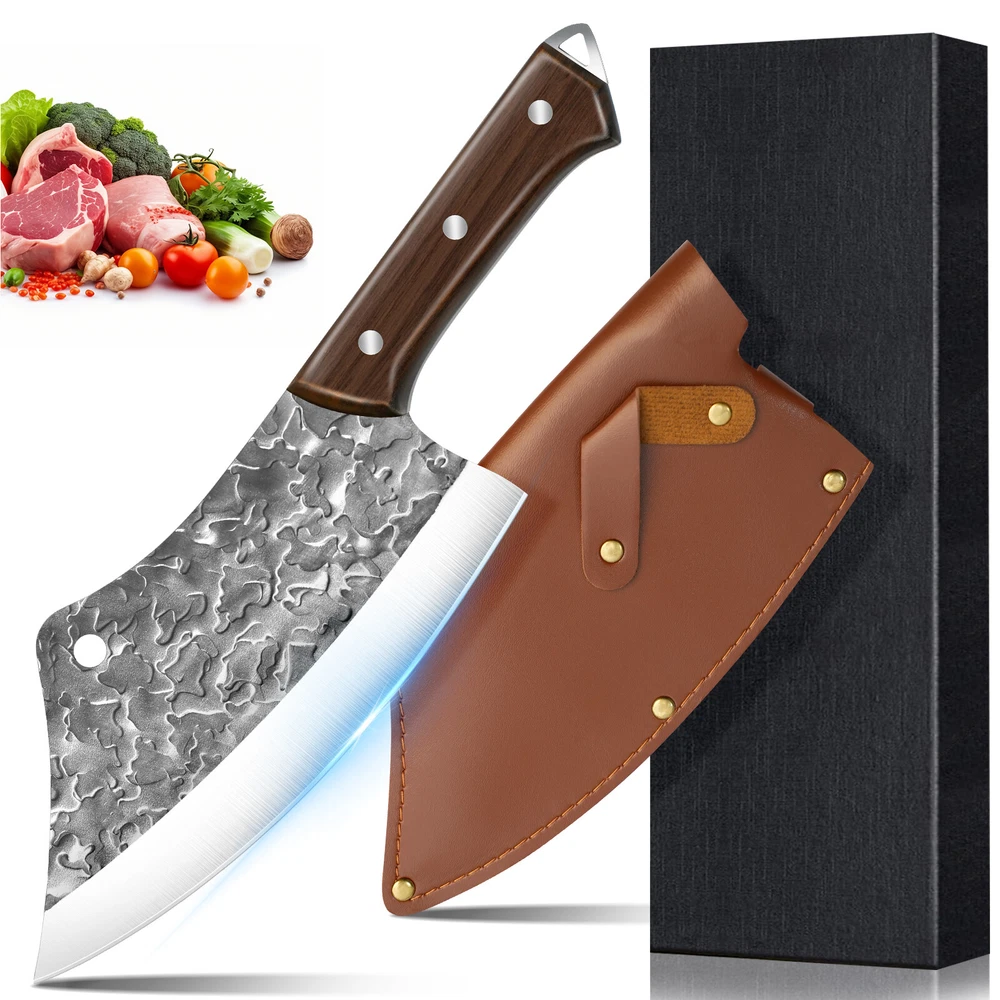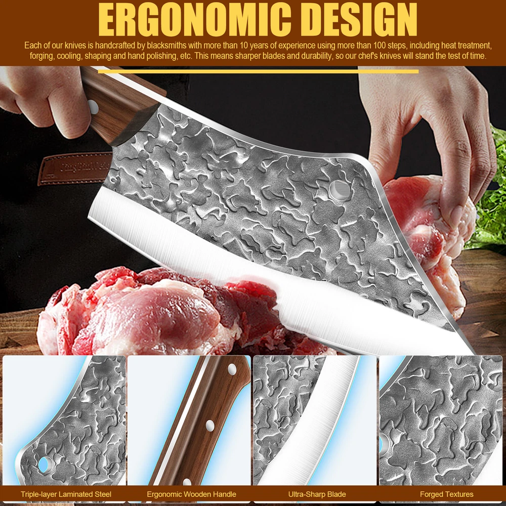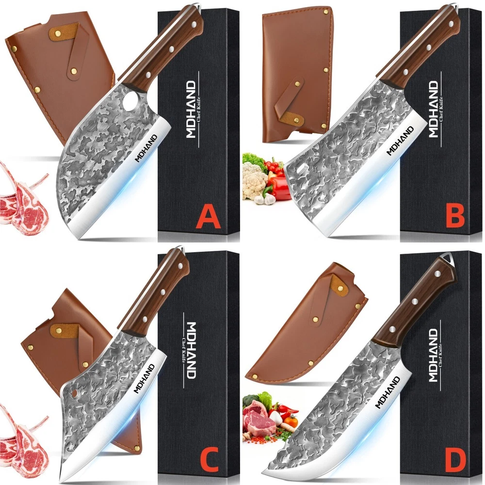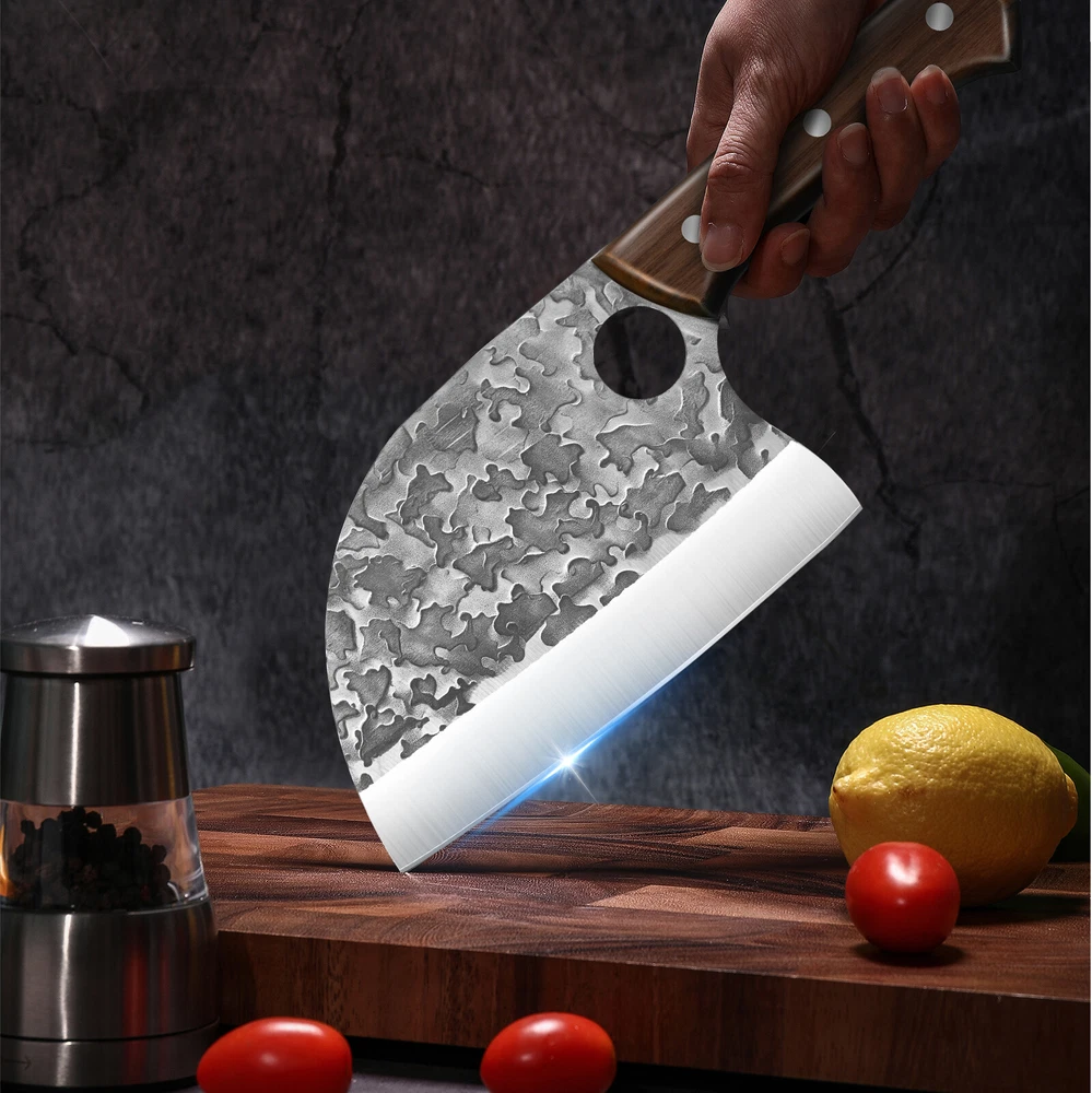 【 HIGH-QUALITY BODY MATERIAL】 Each knife is made of premium stainless steel to withstand the rigors of everyday use and stay sharp for years to come. 【UNIQUE FORGING PATTERN】 Each knife features an exquisite and unique forging pattern handcrafted by artisans, which not only provides excellent cutting performance but also makes it a piece of art in the kitchen. 【COMFORTABLE HANDLE DESIGN】 The ergonomic handle design is made of a combination of walnut wood and copper nails to ensure a comfortable and secure grip. Say goodbye to slippery handles and you will enjoy easy and precise cutting. 【IDEAL GIFT CHOICE】This knife set is not only practical but also beautifully crafted, making it ideal for cooking enthusiasts. Give the gift of precision and style to you or a friend with this outstanding set of knives.
