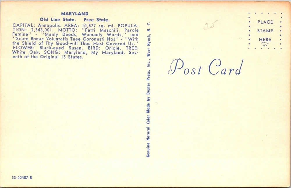 Type: Printed (Lithograph) Country: USA Original/Licensed Reprint: Original City: Maryland Region: Maryland Country/Region of Manufacture: Unknown Era: Chrome Unit of Sale: Single Unit Subject: Cities & Towns Postage Condition: See Image Theme: Cities & Towns
