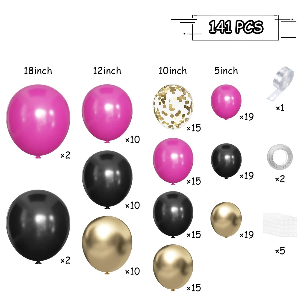 MEBAY Black Red and Gold Balloon Arch Kit, 141Pcs Matte Black Hot Pink Gold Metallic Gold Confetti Balloons for Birthday Wedding Bachelorette Gender Reveal Anniversary MEBAY 141Pcs Matte Black, Red, Gold Metallic, Gold Confetti Balloons Arch Kit 18 " Balloons: Matte Black, Red - 2 for each, total 4pcs 12 " Balloons: Matte Black, Red, Gold Metallic - 10 for each, total 30pcs 12 " Balloons: Gold Confetti - 5 for each, total 5pcs 10 " Balloons: Matte Black, Red, Gold Metallic - 15 for each, total 45pcs 5 " Balloons: Matte Black, Red, Gold Metallic - 19 for each, total 57pcs Balloon Strip x 1 roll Glue Dot x 5 sheets Balloon Ribbon x 2 roll 141 Pcs Balloon Arch Kit: Matte Black, Red, Gold Metallic, Gold Confetti (18"/4pcs, 12"/35pcs, 10"/45pcs, 5"/57pcs); Balloon Strip (1 roll-16ft), Glue Dot (5 sheets-100dot), Balloon Ribbon (2 roll-66ft). Skin-friendly Material: made of natural latex, non-toxic, no foul odor, Not easily oxidized, and kept in the state about 5-7 days. Enjoy the DIY: fill with air or helium, comes with accessories needed to assemble the garland arch, which can effectively make you complete the party decoration easily and funny. Wide Application: perfect for any event, such as graduations, engagements, weddings, anniversaries, baby showers, corporate events, photo shoots and so on. Attention & Warning: Please DO NOT overinflate the balloons, and avoid sunburn, overheat, pointed object and excessive friction. Please kindly note that it's normal for 1-3 out of every 100 pcs to hole or be popped due to vacuum packaging. Shipping from the USA All of our products are shipped from the USA, ensuring quick delivery to your destination. Payment We offer the following payment methods: PayPal, credit card, bank transfer, and eBay's secure payment system. Free Shipping & Free Returns Shipping within the USA is FREE. Additionally, any return is absolutely free for you. Risk-Free Purchase You have the option to return an item within 30 days without any justification. We cover the return shipping costs! Fast Shipping We ship immediately upon receipt of payment. Generally, the package is delivered within 2-3 days in the USA. If it takes longer, we will contact you. Quality and Costs Made in Europe, USA, China No customs fees or additional charges Total satisfaction guarantee Invoice with declared VAT available upon request in .pdf format Feedback Your feedback is very important to us. After you pay for your purchase, you will automatically receive positive feedback from us.