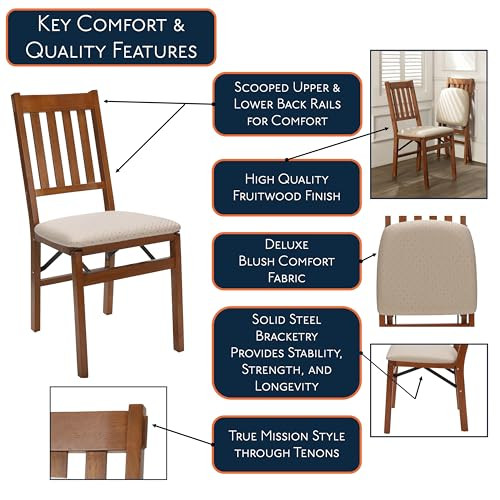 This Arts and Craft Dining Chair embraces the arts and crafts period of furniture with it's wide slats and full threw tenons on the backpost of the chair and will make the perfect extra seating alternative for your home. The chairs are constructed of solid hardwoods with a steel folding mechanism and padded upholstered seat. Premium solid wood construction Blush fabric upholstered seat No assembly required Folds to 8“ deep for storage Seat Height: 19"