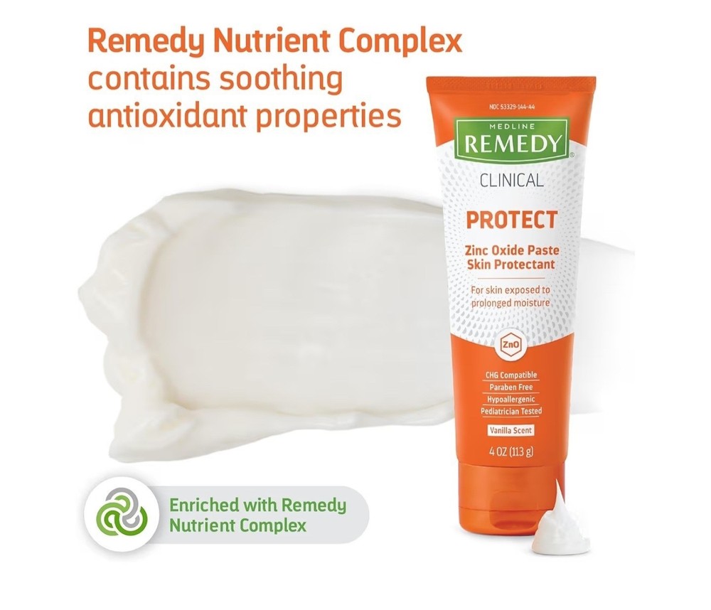 Medline Remedy Zinc Oxide Paste Skin Protectant Unscented 4oz. Experience unparalleled skin protection with our Remedy CLINICAL Zinc Oxide Paste Skin Protectant, expertly crafted by top dermatological specialists to shield sensitive skin from the irritations caused by moisture, urine, or feces. This premium solution is perfect for managing diaper rash and safeguarding against incontinence-related discomfort. Featuring a robust concentration of petrolatum, it ensures enduring defense, minimizing the frequency of applications and potential irritation to sensitive areas. Enhanced with 17% micronized zinc oxide, our paste promotes skin breathability and boasts a creamy, easy-to-apply consistency, effectively adhering to even weepy or exudative skin to offer soothing relief and robust protection. Medlines meticulously designed hypoallergenic formula is suitable for all skin types, making it safe for both adults and children aged 2 and up. Free from sulfates and parabens, it relies solely on high-quality, tested ingredients, excluding any harmful additives, ensuring a gentle yet effective approach to skin care. Compatible with CHG, it is the go-to choice for healthcare professionals catering to diverse patient needs.Infused with our exclusive Remedy Nutrient Complex, previously known as Phytoplex, this CLINICAL protectant paste is enriched with a powerful blend of botanicals, antioxidants, natural oils, and moisturizers to provide optimal support for dry, irritated skin. Available in convenient squeeze tubes or packets, it fits effortlessly into any purse, travel bag, or bedside drawer, ensuring your skin protection regimen remains uninterrupted. As the leading provider of skin care solutions in the healthcare sector, we are dedicated to delivering exceptional care for skin types prone to risks from age, environmental factors, medical conditions, or simple everyday dryness. Elevate your skin care routine with Remedy CLINICAL Zinc Skin Protectant Paste and discover the difference of advanced care designed to exceed the ordinary Medline Remedy Zinc Oxide Paste Skin Protectant Unscented 4oz, 1 Pack Keep your skin safe and healthy with Medlines ultra-thick paste! Made with 15% zinc oxide and 49% white petrolatum, it's perfect for protecting damaged skin from prolonged moisture exposure. Say goodbye to chapped or cracked skin with this soothing formula Keep your skin safe and healthy with Medlines ultra-thick paste! Made with 15% zinc oxide and 49% white petrolatum, it's perfect for protecting damaged skin from prolonged moisture exposure. Say goodbye to chapped or cracked skin with this soothing formula Gently glides on for effortless application, sealing out moisture while effortlessly wiping off Perfect for managing incontinence with care and comfort in mind. Gentle on the skin, without fragrances or dyes, making it suitable for all skin types. Size: 4 oz Qty: 1 Pack
