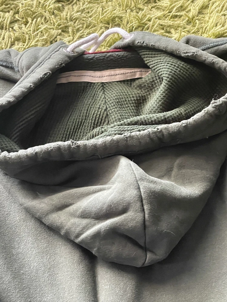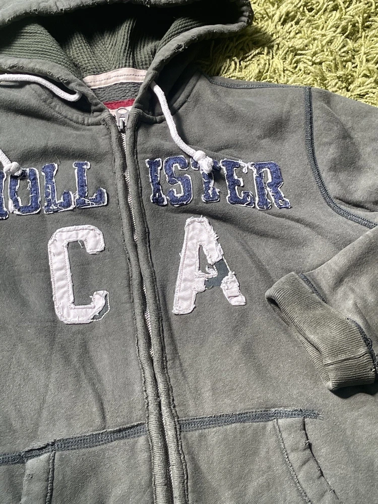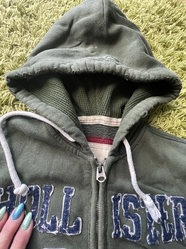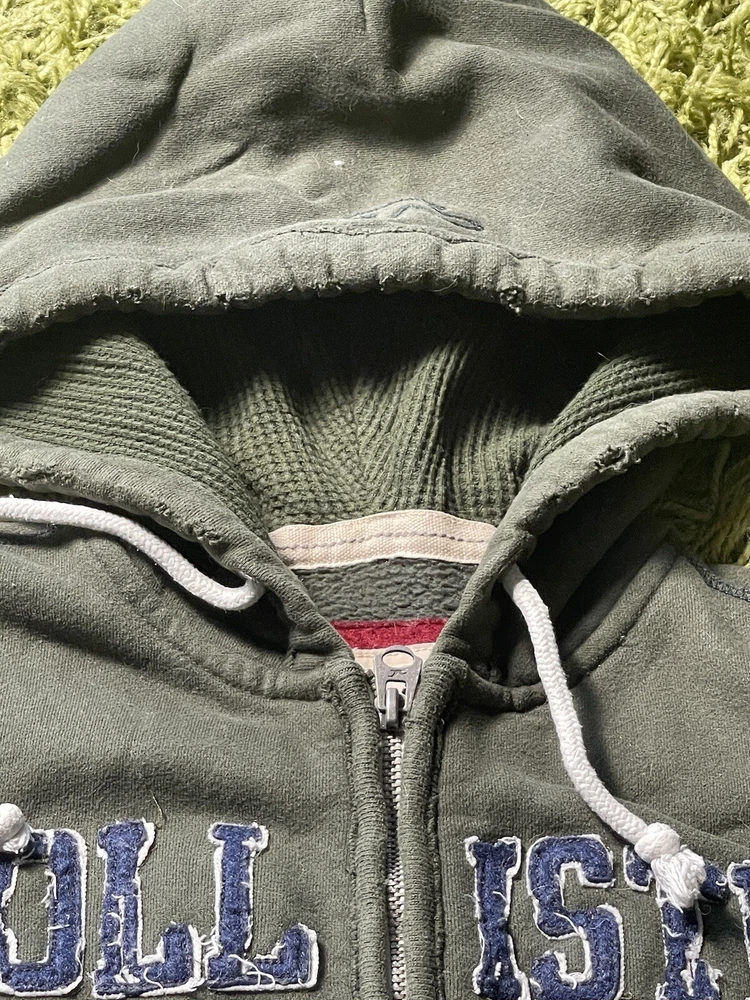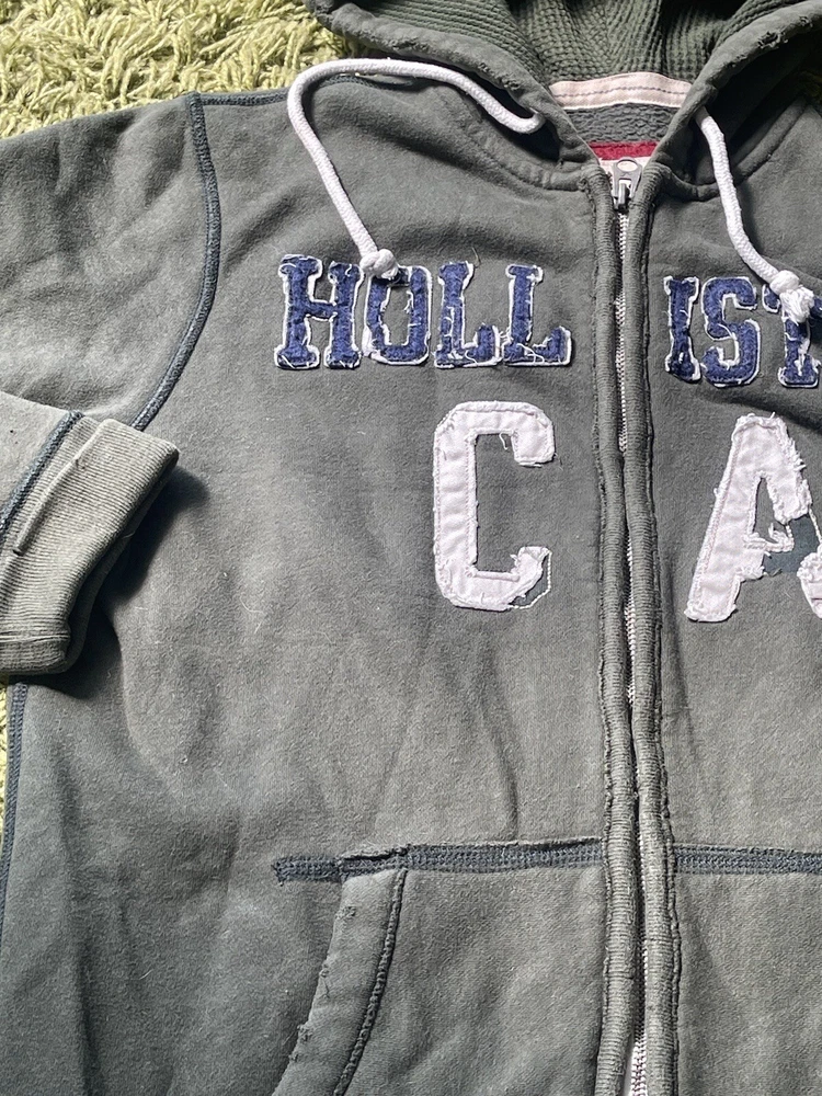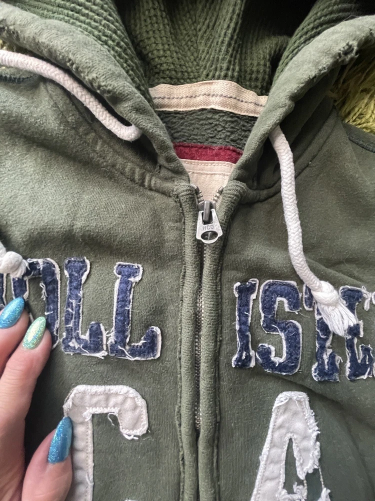 Elevate your wardrobe with this stylish Hollister hoodie in khaki green. Featuring a distressed look, this zip-up hoodie is made of comfortable jersey cotton material and has a crew neck with long sleeves. The hoodie has a regular fit and comes in size M. This full-zip hoodie has many features such as graphic print, lightweight, stretch, pockets, and is moisture-wicking and breathable, making it perfect for all seasons. The hoodie also has accents such as an embroidered logo and a zip closure. It's machine washable and easy to care for. Get your hands on this stylish and comfortable hoodie from the Hollister product line today!