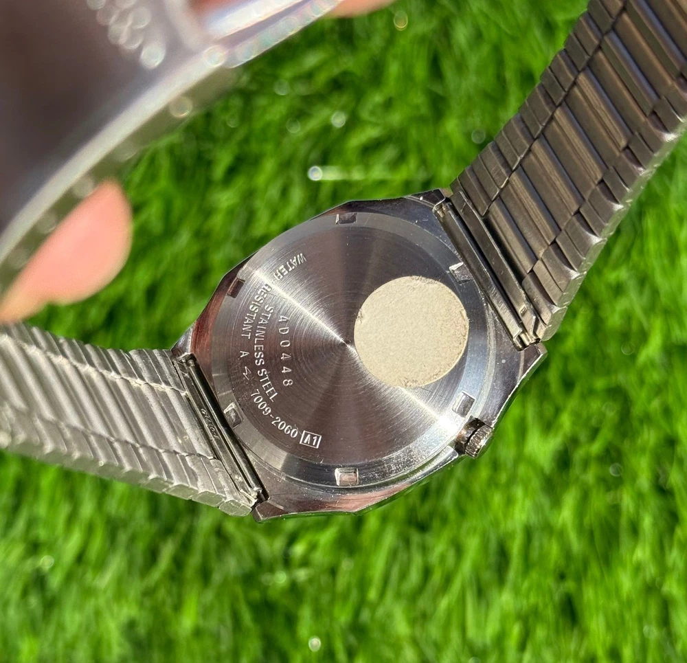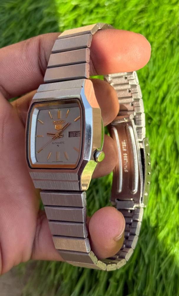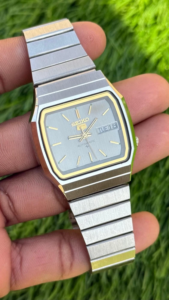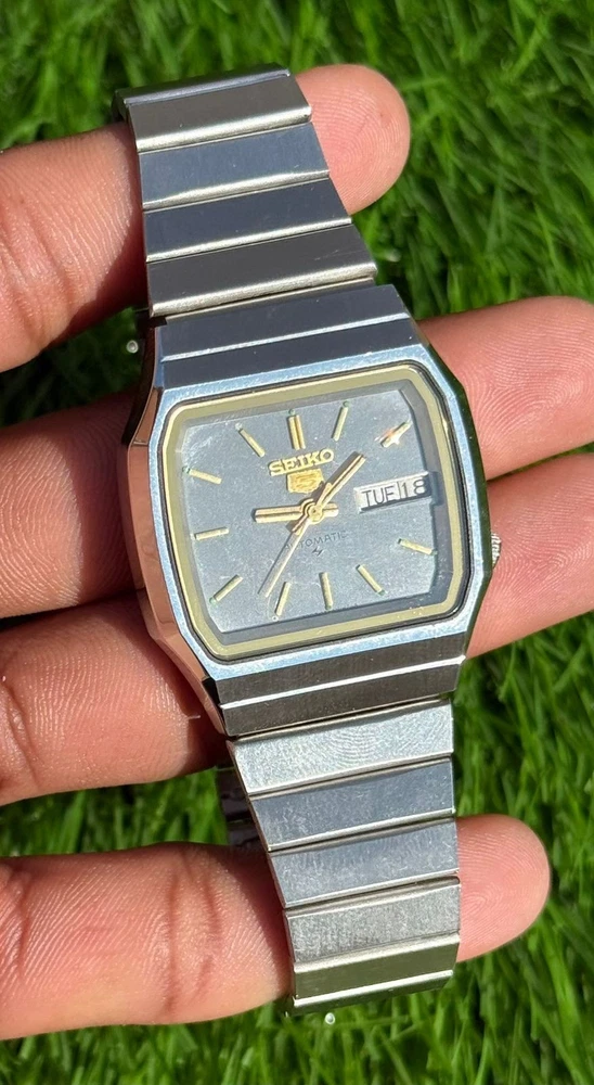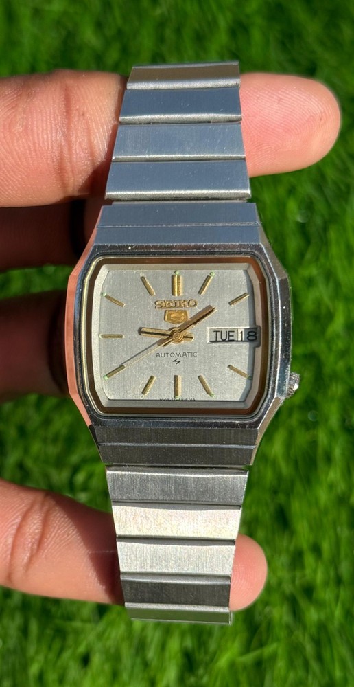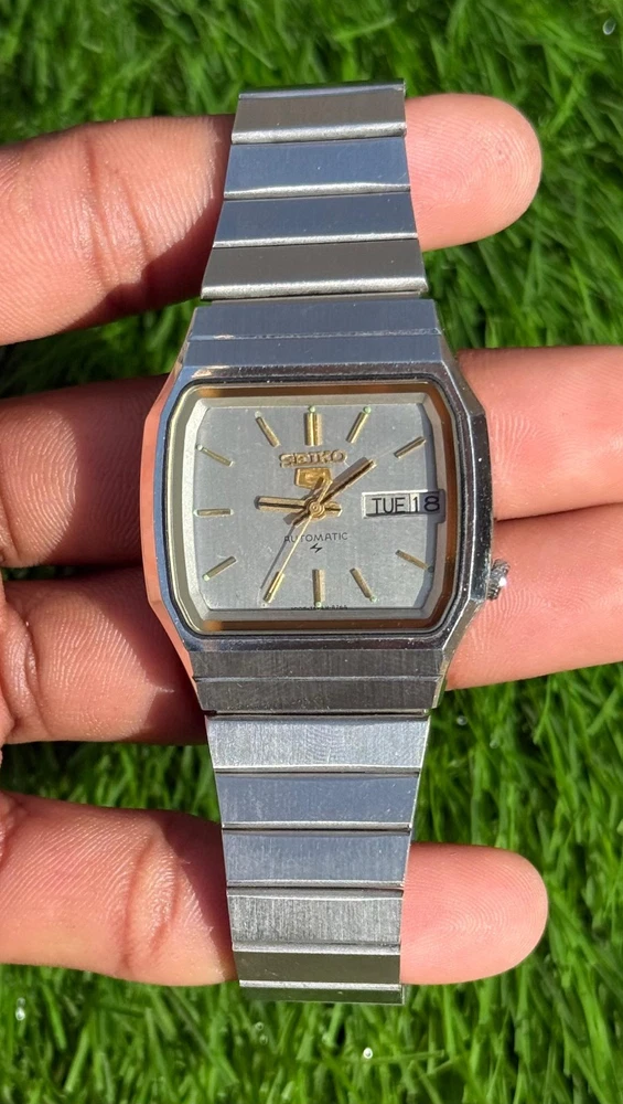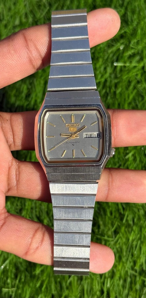 This watch is modified and refurbished the product is a vintage Seiko 5 automatic wristwatch with a square steel case and a silver bezel and bracelet. It features a mechanical automatic movement with 17 jewels and day/date display. This classic timepiece is a timeless piece of jewelry for men who appreciate vintage luxury watches.