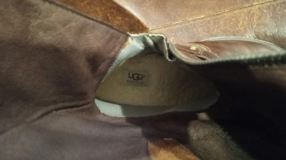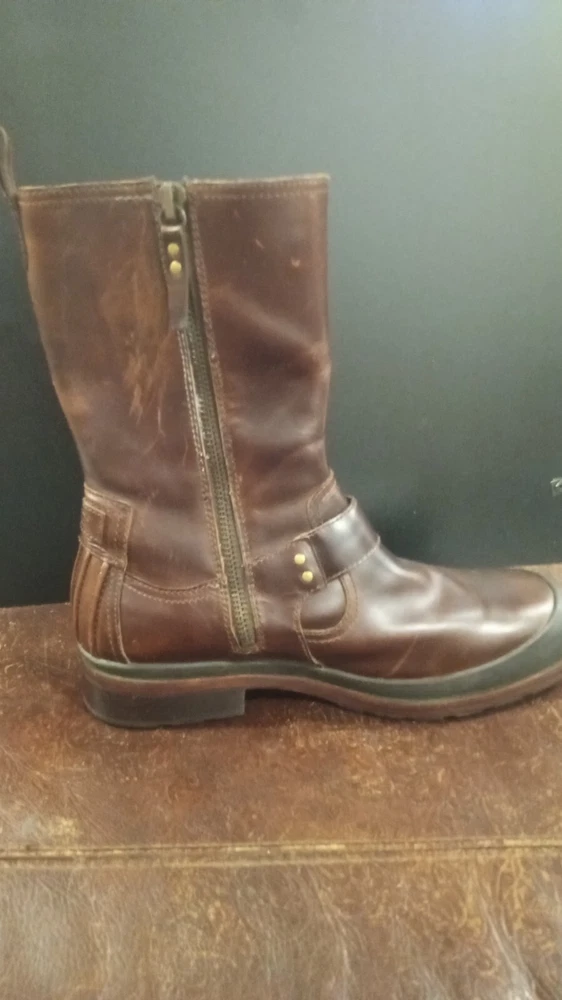 Elevate your style statement with these men's UGG Classic biker riding boots. Crafted with waterproof leather and a zipper closure, these boots are perfect for any occasion - from casual outings to activewear to travel. The round toe shape and adjustable strap with buckle accents ensure a comfortable fit, while the leather lining and insole provide added comfort. These vintage-inspired boots feature a solid pattern and a mid-calf shaft style, making them a versatile addition to your wardrobe. The boots come in a classic brown color and are available in US shoe size 13 and UK shoe size 12. BOOTS ARE 12" FROM BOTTOM OF HEEL TO TOP, FULL ZIPPER, ADJUSTABLE BUCKLED. SOME VERY LIGHT SCUFFING ON ZIPPER SIDES. BEAUTIFUL BOOTS !!!!