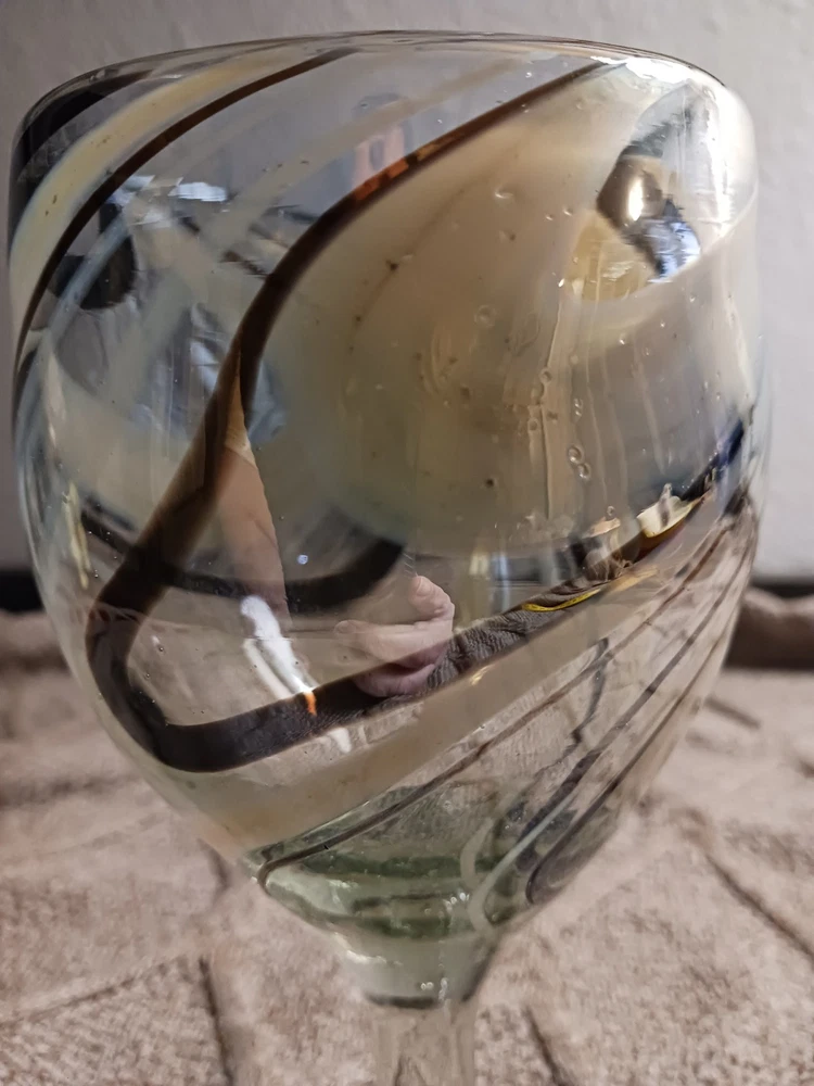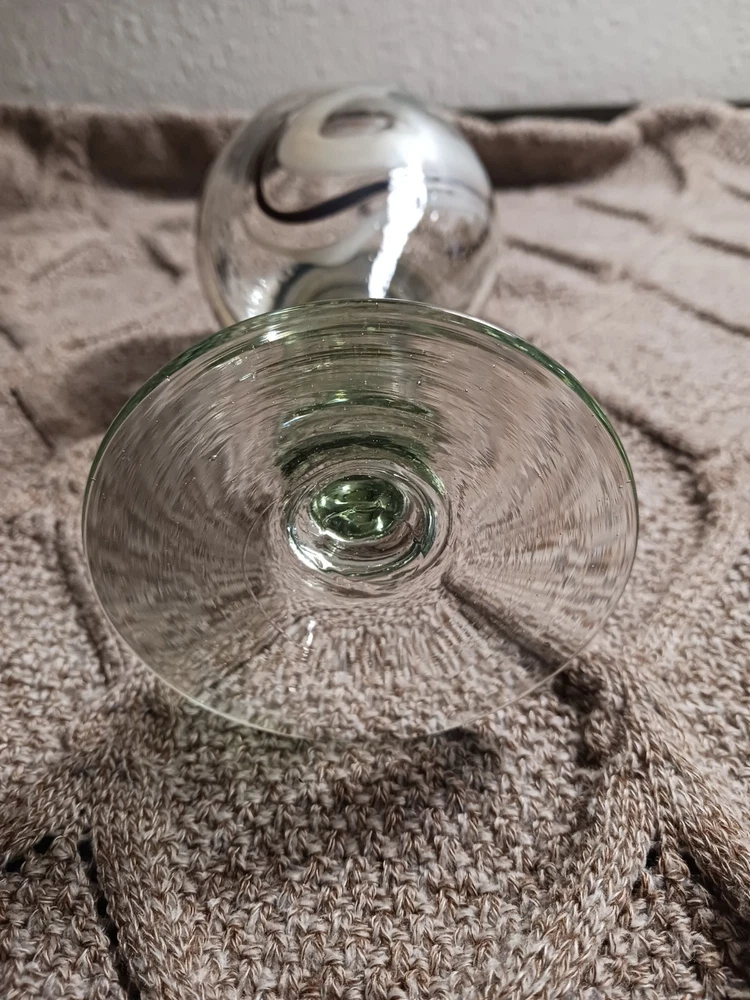The Mexican Cocoa/Vanilla Gold Swirl Wine Goblet is a hand-blown glass goblet featuring a rustic Mexican design. Each goblet has a swirl pattern in brown and gold colors, with a capacity of 12 oz. The goblet has a height of 7 1/4" and a width of 3 5/8", making them suitable for all occasions. The glassware is from Mexico and should be hand washed only, adding to its authentic and unique appeal. Perfect for enjoying wine or other beverages in a stylish and elegant manner. Like new condition. No chips or cracks