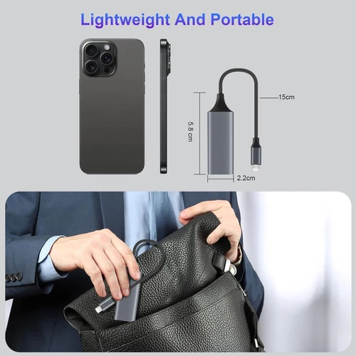 [MFi Certified] Lightning to Ethernet Adapter, 100Mbps Lightning to RJ45 Ethernet LAN Network Adapter, Compatible for i-Phone 14/13/12/11/i-Pad/i-Pod, Plug and Play (Non-POE) LuxeFusion Product Description Features Fast And Stable Connection: The Lightning to ethernet adapter provides your Lightning Port devices with a wired connection, solving the WiFi or wireless network slow and unstable problem. The adapter one end connects your i-Phone/ i-Pad/ i-Pod devices, and the other end connects your ethernet cable Supports 100Mbps High Speed: The lightning ethernet adapter supports a internet speed of up to 100Mbps and enables your lightning devices to run at full speed. Enjoy fast and stable connection with video calling, online meetings, downloading large files,fluent streaming or immersive gaming Wide Compatibility: (NOT Support Charging, Non-POE.NOT Support i-Phone 15 Series) The Lightning to ethernet adapter works well as a communication bridge. The adapter lightning port connects your i-Phone14 or before, such as i-Phone14/ 13/13 Pro/13 Pro Max/12/12 Mini/12 Pro/12 Pro Max/SE 2020/11/11 Pro/11 Pro Max/XR/XS/XS Max/ i-Pad/i-Pad Air /i-Pad Air 2 and i-Pod Pro, etc. The another end is connected your ethernet cable Sleek And Sturdy Adapter: The lightning ethernet adapter is designed with premium and smooth aluminum housing, and the RJ45 ethernet port supports multiple plugging and unplugging. Also well-built in with Smart Realtek chip, making the adapter Indicator lights transmission status clear at a glance, ensuring the network always at peak running Easy to Use: NO additional software or drivers needed. Get connected in less than 5 seconds. Firstly, turn off your i-Phone/i-Pad/i-Pod Cellular Data or WIFI; Next connect the adapter lightning port into your i-Phone/i-Pad/i-Pod, and plug your ethernet cable into the adapter ethernet port. Than you can enjoy a stable and high-speed internet connection. Product Details Package Dimensions: 5.71 x 3.78 x 0.75 inches Item Weight: 1.13 ounces Item model number: GWlightTORJ45001 Manufacturer: Junsky Compatible Devices: Smartphone Connector Type: Lightning, RJ45 Ethernet Color: Gray Brand: Junsky Item Weight: 0.03 Kilograms 🚚 Free Shipping All orders ship free and fast to your doorstep. 🔁 Easy Returns Satisfaction guaranteed. 30-day returns, no questions asked. 💬 24/7 Support Contact us anytime; we’re here to help, day or night. Brought to you by LuxeFusion – Quality you can trust.