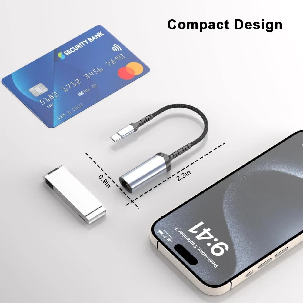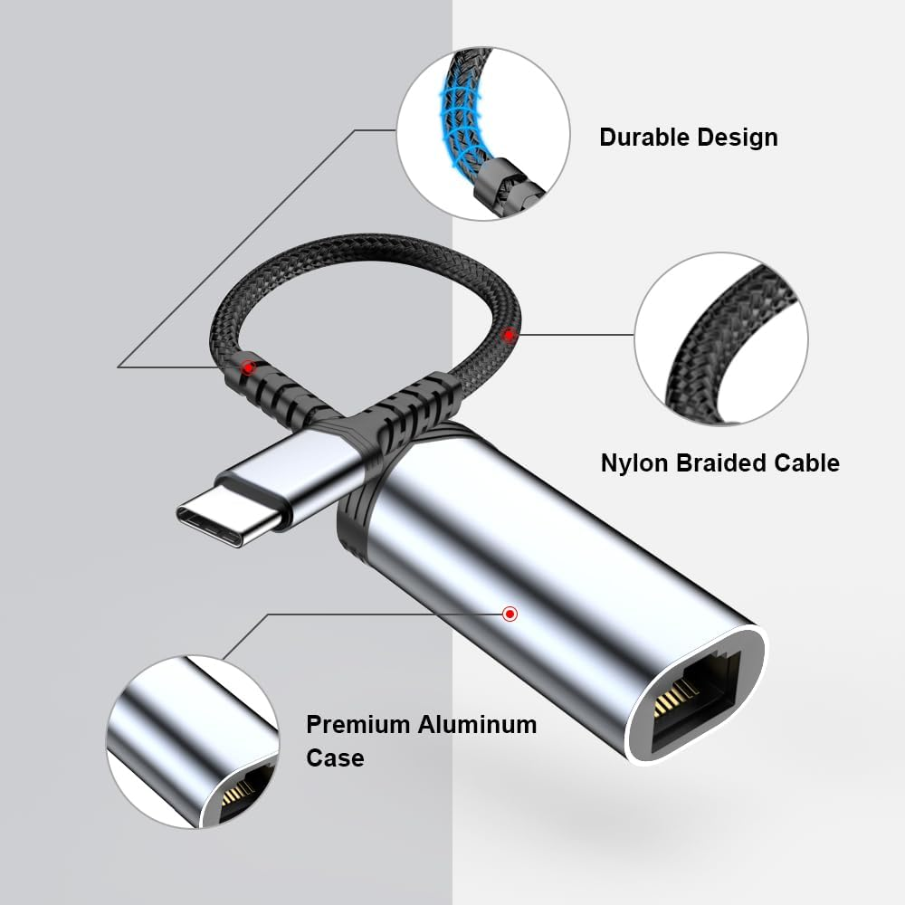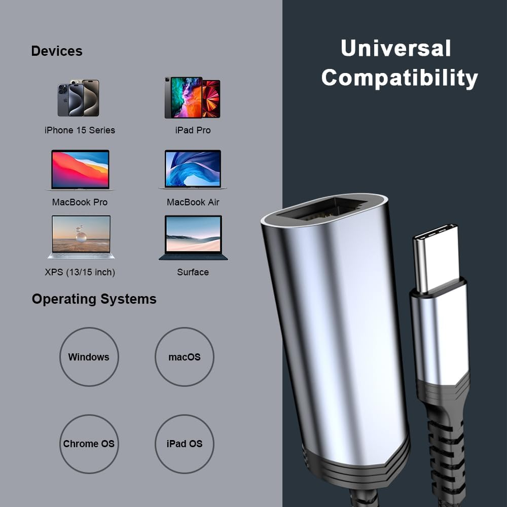 【Reliable & Endurance Connectivity】Designed specifically for plug and play connection between iPhone 15 /15 Pro/15 Pro Max/PC/Laptop/USB-C devices and wired network, provides gigabit ethernet connectivity even when wireless connectivity is Inconsistent or over extended. 【Universal Compatibility】USB C ethernet adapter works with iPhone 16/15/15 Pro/15 Pro Max/iPad/iPad Air /Macbook/for Galaxy/Pixel/Laptop/PC and more USB C devices. High-quality iPhone 15 Ethernet Adapter connector provides snug connection with your devices for stable signal transfer. Design to make it easy to connect USB peripherals without blocking adjacent USB-C ports. 【Thoughtful Design】Compact and lightweight, with a user-friendly non-slip design for easier plugging and unplugging. Braided nylon cable for extra durability. Premium aluminum casing for better heat dissipation. 【Surfing at Full Speed】Obtain stable connection speeds up to 1 Gbps, downward compatible with 100Mbps/10Mbps/1Mbps. Our Type-C to LAN Ethernet RJ45 Network Adapter will take your internet surfing up to the next level. Larger downloads, maximum velocity, and no more interruption. With our ethernet adapter, gigabit connectivity means much more than just fast internet. 【What You Get】1 * iPhone 15 RJ45 Gigabit network adapter,18 months worry-free warranty and 24/7 friendly customer service. Any problems with this iPhone 15 ethernet adapter, contact us for fast support, we will reply within 12 hours. USB C to Ethernet Adapter,iPhone RJ45 to USB 3.0 Type-C Ethernet LAN Network Adapter,USB-C to RJ45 LAN Adapter,Nylon Braided Cat 5/6/7/8 Network Cable Converter Connector Compatible with iPhone 15 15 Pro 15 Pro Max iPad MacBook Pro iPad Galaxy Laptop PC and More (Space Gray),Gigabit Cat Network Cable Converter 【Compact & Friendly Design】 Compact and lightweight, with a user-friendly non-slip design for easier plug and unplug. Fits snugly with the USB-C ports on your devices, better signal transfer protection. Braided nylon cable for extra durability. Premium aluminum casing for better heat insulation. 【Small and Convenient】 The iPhone RJ45 ethernet LAN Network adapter is very convenient used in your daily life, put in your pocket or your bag and carried with your iPhone so that you can Share your photos on social media everywhere. Use this iPhone RJ45 ethernet LAN Network adapter to connect macbook/PC/laptop to a wireless RF mic network. 【Compatible List】 Compatible with iPhone 15 /iPhone 15 Pro /iPhone 15 Pro Max Compatible with iPad Compatible with MacBook Air/MacBook Pro Compatible with Pixel Compatible with Samsung Galaxy S22 / S21 / S20 / S20+ / S20 Ultra / S10e / S10 / S10+ Compatible with Samsung Galaxy Note 8 / 9; S9 / S9+ / S8 / S8+ and more 【What You Get】 1 Pack * USB-C to RJ45 Ethernet Adapter 18-month worry-free warranty and friendly customer service.