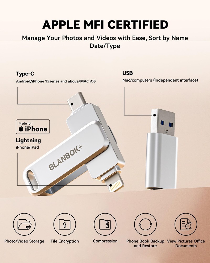 BLANBOK+ MFi Certified USB Thumb Drive - Allows You Share Data Between Various Devices Easily Multi-Interface Design: BLANBOK+ memory stick comes with iphone port/Type C/USB A (independent adapter), compatible for iPhone/iPad/OTG Android/PC and other devices with standard USB ports, can transfer data between various devices, easily complete data sharing. Lightweight & Portable: iPhone storage flash drive size is 2.5 * 0.5 * 0.3 inches, small and exquisite, which is convenient for us to carry. Sleek and Durable Metal Casing Photo stick features a stylish yet tough metal casing that protects the jump drive from unexpected knocks. A compact design makes it easy to slip the thumb drive into your pocket, bag, or purse to prevent loss. High-Tech Chip Smart upgraded chip, its read speeds up to 40m/s and write speeds up to 80m/s, efficient and stable. Mfi Certified flash drive with upgraded chips and unique looks provide you with a more efficient storage experience. Wide Compatibility The usb storage flash drive supports a variety of format files, making it more versatile and no longer limiting the freedom of transmission. Supported System --- iOS 7.1.2 or above /Macos /Windows / Android Plug and Play: Share your photos, videos, songs and other files between iPhone picture stick easily. You don't have to pay extra for additional storage, just insert iphone external storage and enjoy the extra space of your flash drive. One-Click Backup: You can easily backup with one click and manage files at any time. No need of iTunes, manage files, phone address book, pictures and videos through the mobile app to quickly backup to BLANBOK+ flash drive, save the storage space of the mobile phone, and at the same time, operations such as forwarding files on the usb drive can be performed. Protect File Privacy: The General Password & Touch ID can encrypt file information in APP to protect your private files and prevent theft. Convenient and User-Friendly: This MFi-certified 128GB iPhone flash drive allows you to easily backup your phone photos, videos, and phonebook with just one click using the app on the pen drive. You can also backup files to your computer using the USB port, providing double protection. (Note: To use this jump drive on an iPhone/iPad, please go to the App Store to download and install the "BLANBOK+" app. For Android phones, simply enable the OTG function, no need to download additional apps.) Fast Data Transfer: This photo stick for iphone uses high-speed transfer port and high-quality flash memory chips, enabling fast data transmission. Whether it is large files, high-resolution photos, or HD videos, it can complete them quickly, saving your time. Furthermore, it also boasts outstanding resistance to high temperatures, water, dust, drops, and magnetic interference. Its built-in keychain design allows you to carry it with you, preventing loss. Document and Photo Storage: This iphone photo storage stick provides a large storage capacity of 128GB and features Lightning/Type C/USB interfaces (with separate adapters) for convenient data transfer between different devices. No longer reliant on data cables, iTunes, or iCloud, you can securely store important files, photos, and other data. Never worry about running out of storage space on your iPhone again - you can easily store files on the USB drive and access and share them anytime. Freeing up phone space:The iphone memory stick is compatible for iOS devices running iOS 12.1 or later, OTG Android phones, computers, and other devices with USB ports. You can transfer unused or large files that occupy a significant amount of phone storage to the usb flash drive for iphone. This way, you can free up phone storage space, making your iPhone run more smoothly and providing more space for other data and applications. Protect Your Privacy: You have the option to encrypt the entire iphone external storage APP or specific files. While enjoying the convenience of our usb c flash drive, you will also receive our high-quality service. If you have any questions or concerns about the received iphone storage flash drive, please feel free to let us know.