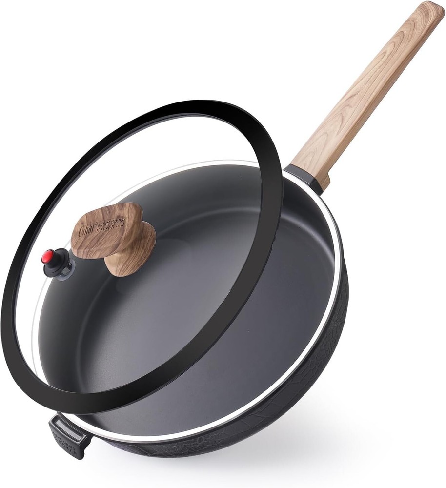 【Healthy Nonstick】:the non stick pans uses Germany C3 + Ceramic Reinforced coating technology,effectively preventing the food from sticking and minimizes oil use,100% PFOA&APEO free. 【Super Easy to Clean】:skillet with lid to its slick non-stick surface, any food particles will easily slip from the pan's surface and minimal scrubbing for a spotless clean, make cleaning easier. 【Suitable For All Stoves】:to let our nonstick frying pan meet the needs of more families, we specially Added and enlarged the induction base delivers quick and evenly heat up and compatible with all stovetops, including Halogen Stoves, Gas, Ceramic, Oven and Electric Stoves. 【Glass Lid & Heat Resistant Handle】:transparent tempered glass lid allows you to monitor the cooking process at any time without opening the lid , heat resistant Bakelite handle grip it comfortably, makes your cooking experience easier and more enjoyable. 【Made to Last】:made of advanced die-cast aluminum technology 6 mm thick bottom and thickened pan body that is 50% longer lasting,this fry pan will surely prove its longevity even after years of use. Dishwasher Safe Simplify your kitchen routine with the dishwasher-safe pan that can handle any cycle, The ceramic coating is durable and resistant to fading or peeling. Oven Safe Enjoy versatile cooking with our frying pan, built to withstand high temperatures in the oven, making it perfect for roasting, baking, and broiling. Easy to Clean The non stick frying pans designed without rivets, any food particles will easily slip from the pan's surface and minimal scrubbing for a spotlessly clean. Stay-Cool Bakelite Handle Soft and comfortable to grip and stays cool while cooking.