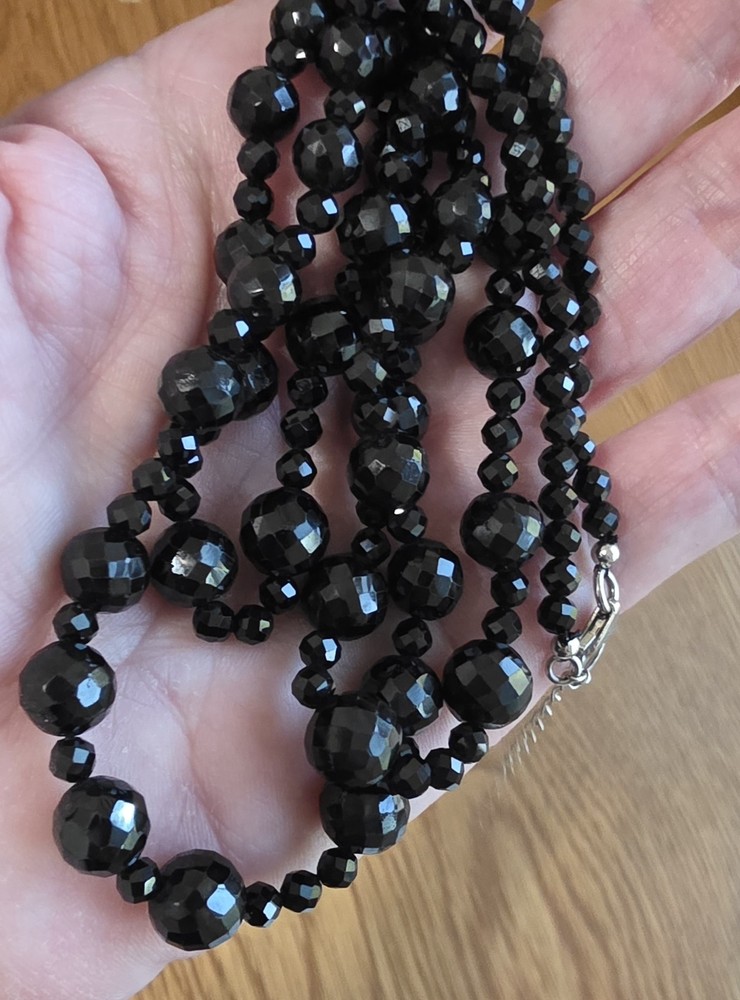 MGI Black Spinel (925 Sterling Silver) Faceted Bead Necklace. Necklace is 20-22" in length and in good pre-owned condition. The largest bead is appx. .3" in diameter. See pics for stone markings, imperfections, and variation in color based on lighting. Box not included Please note: This jewelry was originally purchased as authentic (stones and metals) but was not able to be tested nor authenticated after purchase. (Inventory Bin#5100)