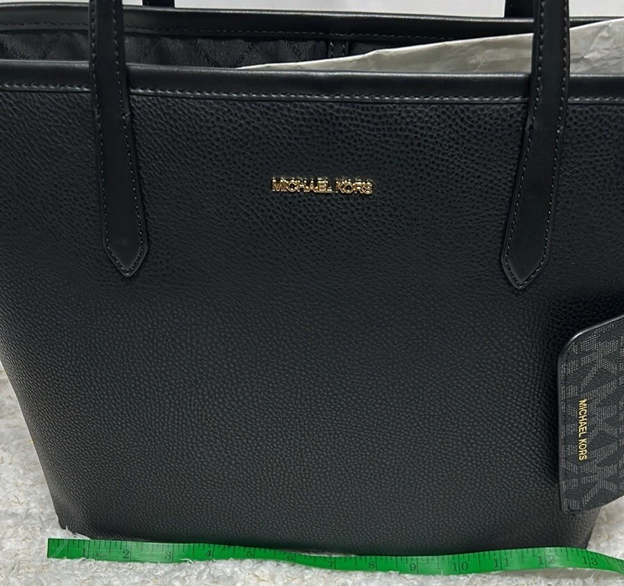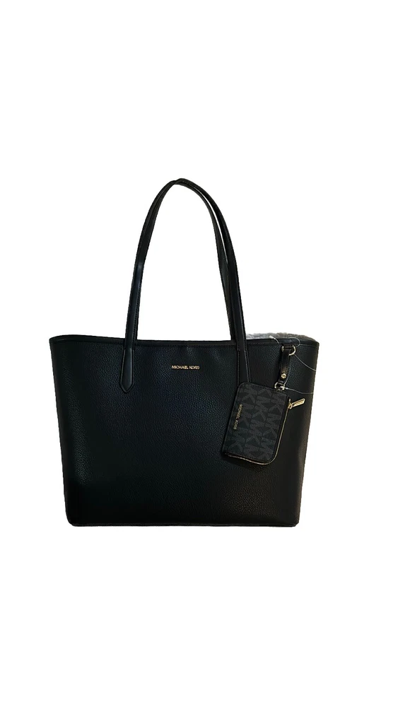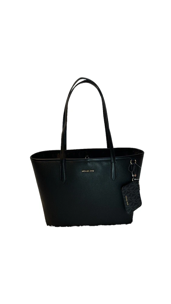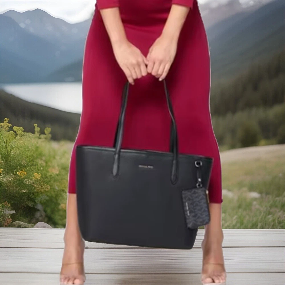 This Michael Kors Jet Set tote bag in black is the perfect accessory for any woman on the go. The bag comes with a pouch and a wristlet, making it a versatile accessory for travel, workwear, or casual use. The Michael Kors Jet Set tote bag is a designer piece that is sure to elevate any outfit.