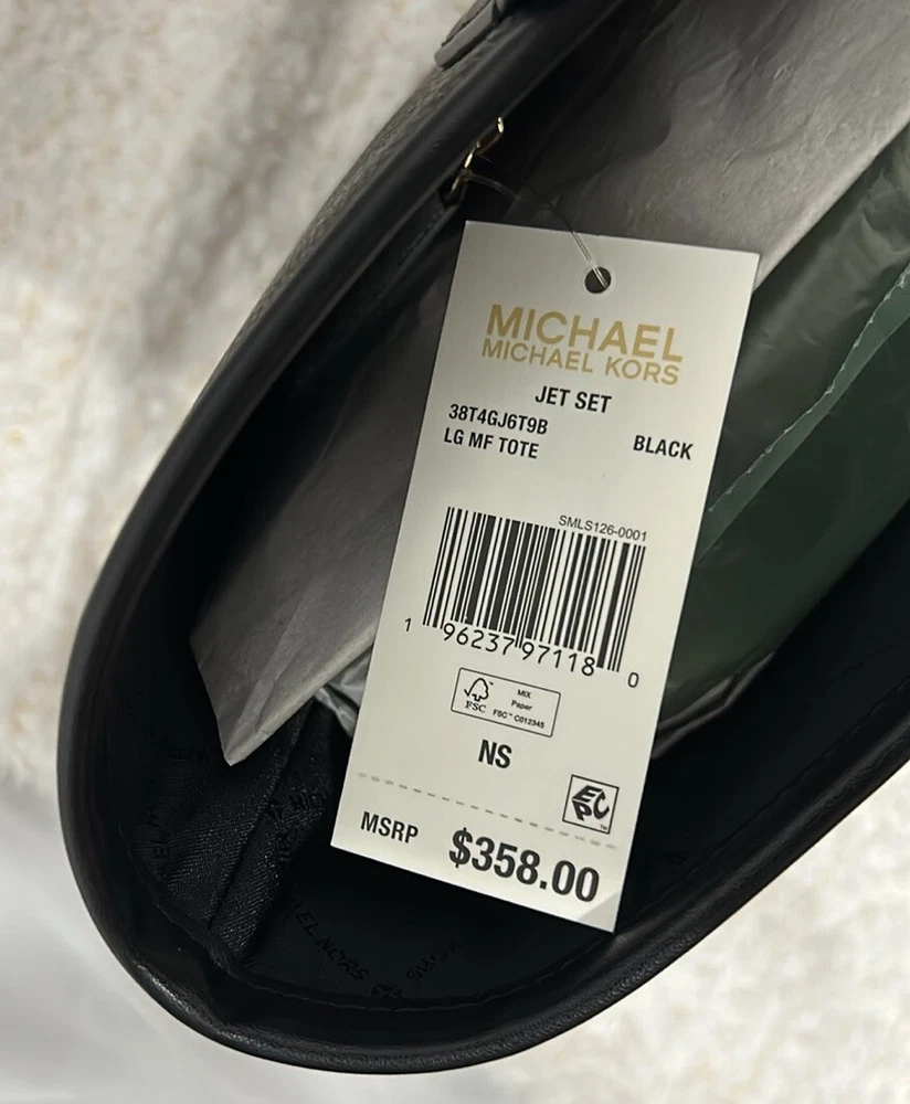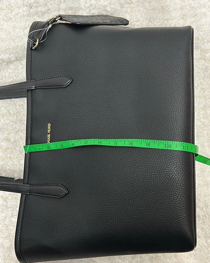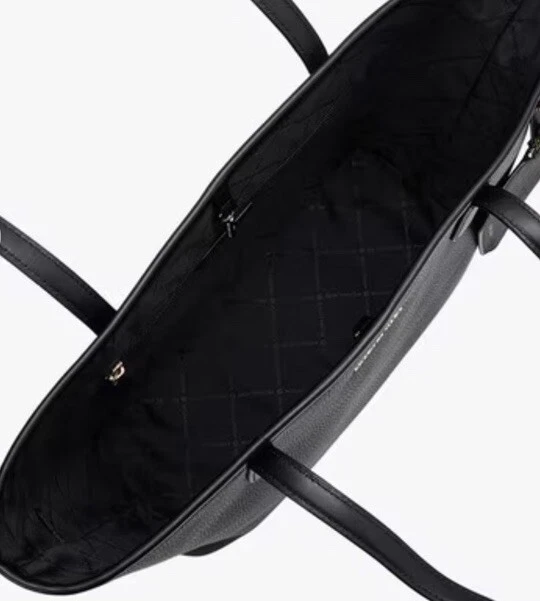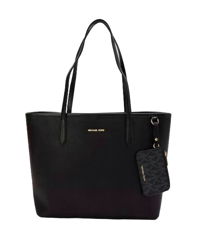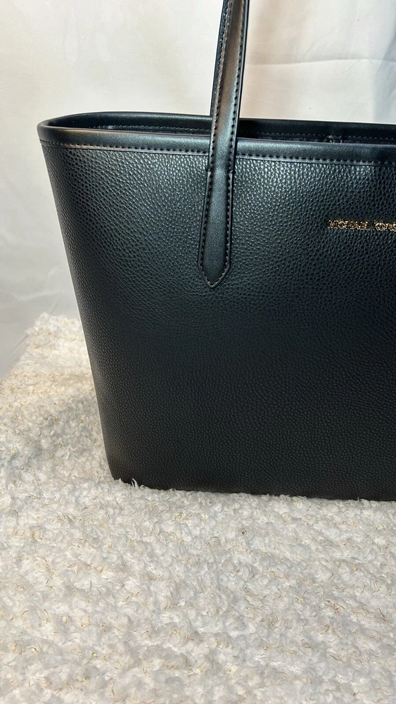 This Michael Kors Jet Set tote bag in black is the perfect accessory for any woman on the go. The bag comes with a pouch and a wristlet, making it a versatile accessory for travel, workwear, or casual use. The Michael Kors Jet Set tote bag is a designer piece that is sure to elevate any outfit.