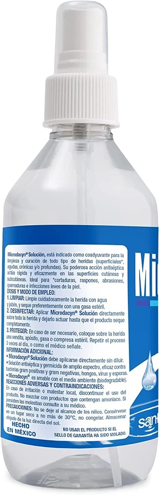 Product Overview: Microdacyn is a cutting-edge antiseptic disinfectant designed to provide superior wound care. It is formulated to promote healing and reduce the risk of infection for various types of wounds, including burns, pressure ulcers, and diabetic wounds. This versatile solution is safe, non-toxic, and non-irritating, making it suitable for regular use. Key Benefits: Burn Treatment: Effectively disinfects burns and aids in faster healing. Pressure Ulcer Care: Cleans and prevents infection in pressure ulcers. Diabetic Wound Management: Supports the healing process of diabetic wounds and minimizes complications. Features: Size: Convenient 240 ml (8 oz) bottle. Effective: Broad-spectrum antimicrobial action. Safe: Non-toxic and non-irritating formula. Versatile: Suitable for various types of wounds and skin conditions. How to Use: Thoroughly clean the affected area with Microdacyn solution. Apply the solution directly to the wound or soak a sterile gauze with the solution and apply it to the wound. Repeat as needed or as directed by a healthcare professional for optimal wound care. Storage Instructions: Store the bottle in a cool, dry place away from direct sunlight. Ensure the bottle is tightly closed when not in use. Caution: For external use only. Avoid contact with eyes. In case of eye contact, rinse thoroughly with water. If irritation or adverse reactions occur, discontinue use and consult a healthcare professional. Keep out of reach of children. Summary: Microdacyn 240 ml Antiseptic Disinfectant is an essential solution for effective wound management. Its advanced formula ensures wounds are disinfected and promotes proper healing, making it a crucial addition to any first aid kit.