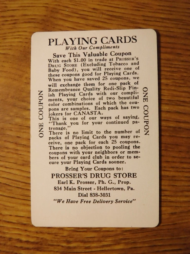 PLEASE READ THIS ENTIRE AUCTION: This auction is for the playing card swap coupon you see in the pictures. These cards are in near mint to mint condition. The shipping and handling in first class mail to any address in the United States is $.99 for the first card and $.29 for each additional card. International bidders: The shipping and handling for this item in first class mail with no tracking is $1.79 for the first card and $.29 for each additional card. I accept Paypal. Please check my feedback and bid with confidence.