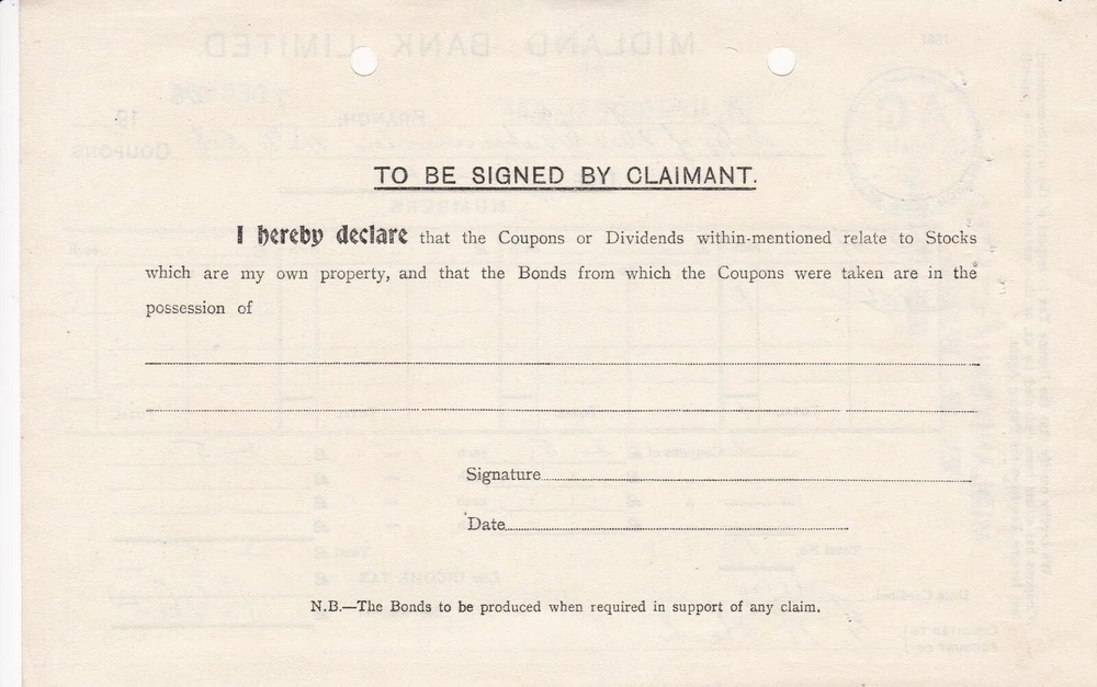 MIDLAND BANK LIMITED 1928 City of New Westminster Deb. Coupons Receipt Ref 45982